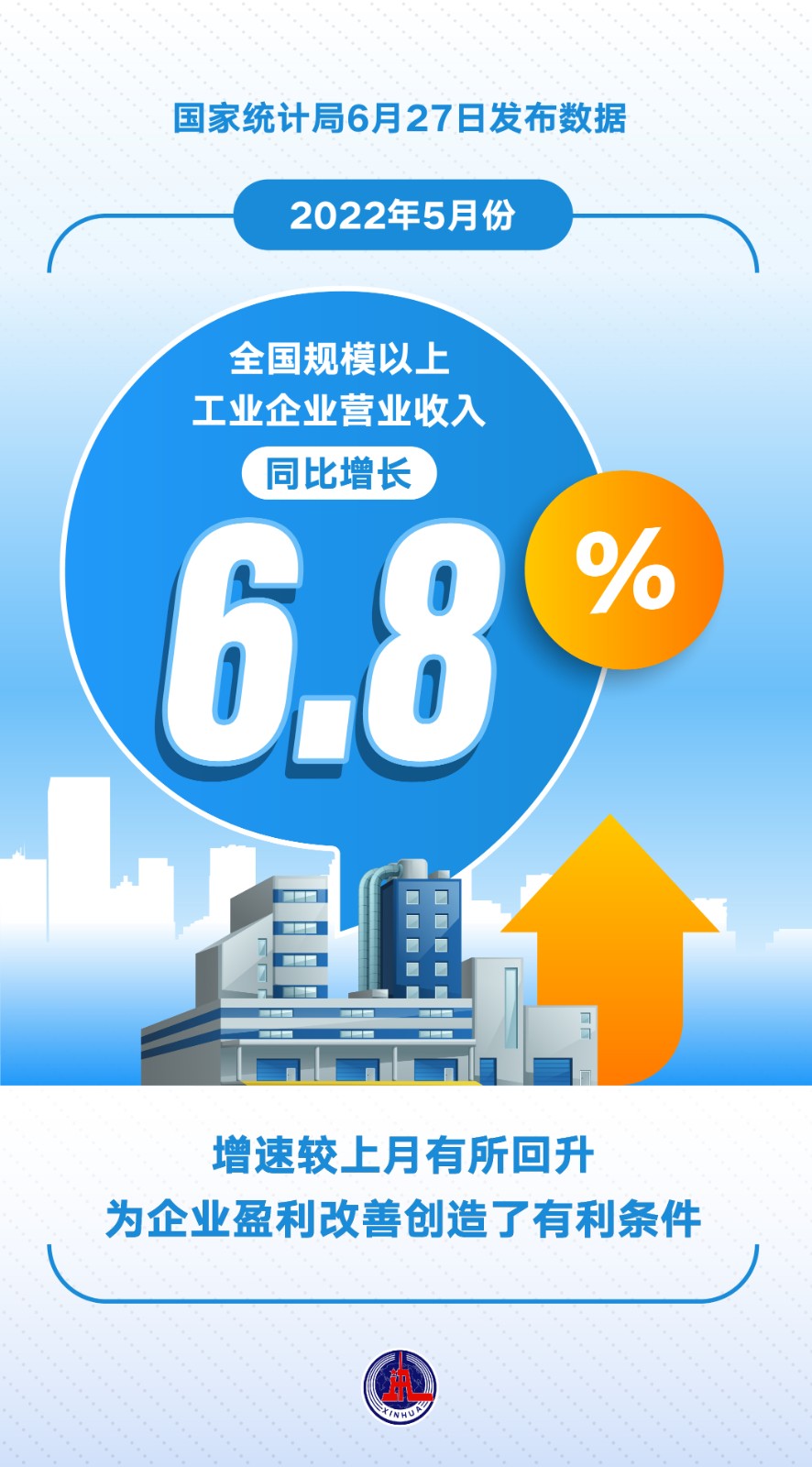 國家統(tǒng)計局6月27日發(fā)布數(shù)據(jù),今年5月份,全國規(guī)模以上工業(yè)企業(yè)營業(yè)收入同比增長6.8%,增速較上月有所回升,為企業(yè)盈利改善創(chuàng)造了有利條件。