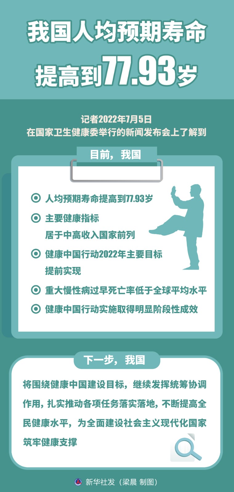 目前,我國(guó)人均預(yù)期壽命提高到77.93歲,主要健康指標(biāo)居于中高收入國(guó)家前列,健康中國(guó)行動(dòng)2022年主要目標(biāo)提前實(shí)現(xiàn),重大慢性病過早死亡率低于全球平均水平,健康中國(guó)行動(dòng)實(shí)施取得明顯階段性成效。