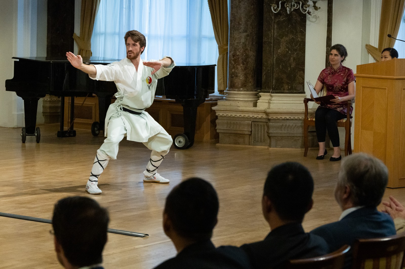這是6月21日在匈牙利布達佩斯舉行的羅蘭大學(xué)孔子學(xué)院成立15周年慶典上拍攝的武術(shù)表演。