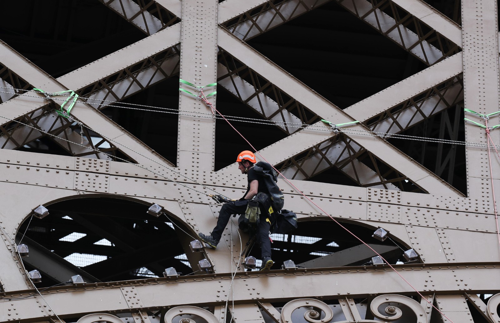 7月7日,工人在法國(guó)巴黎埃菲爾鐵塔上高空作業(yè)。
