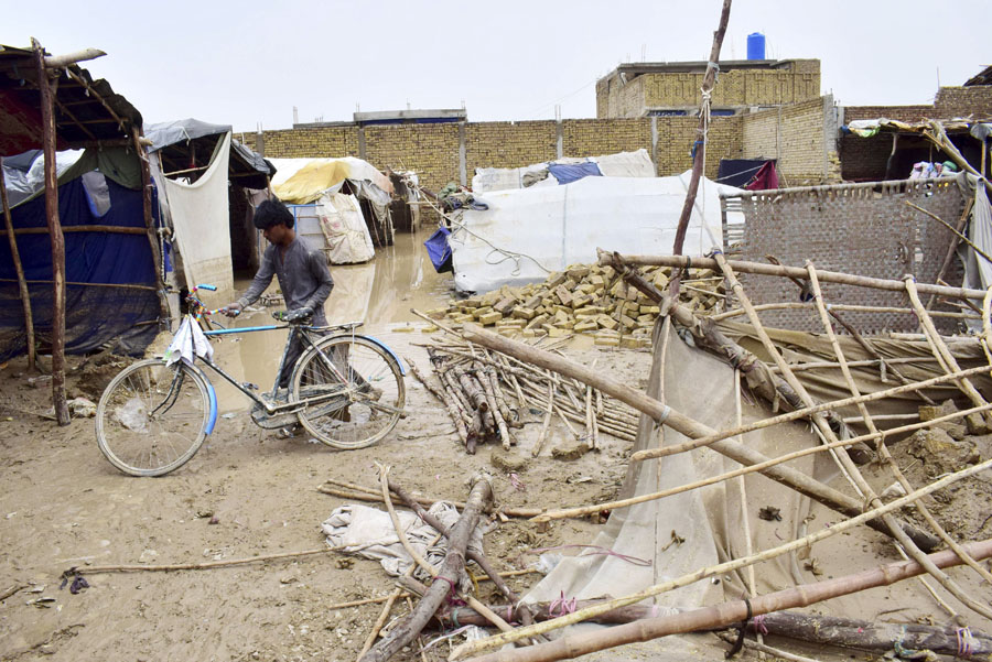 7月5日,在巴基斯坦奎達(dá),一名男子從被暴雨損毀的自家房屋中收拾物品。