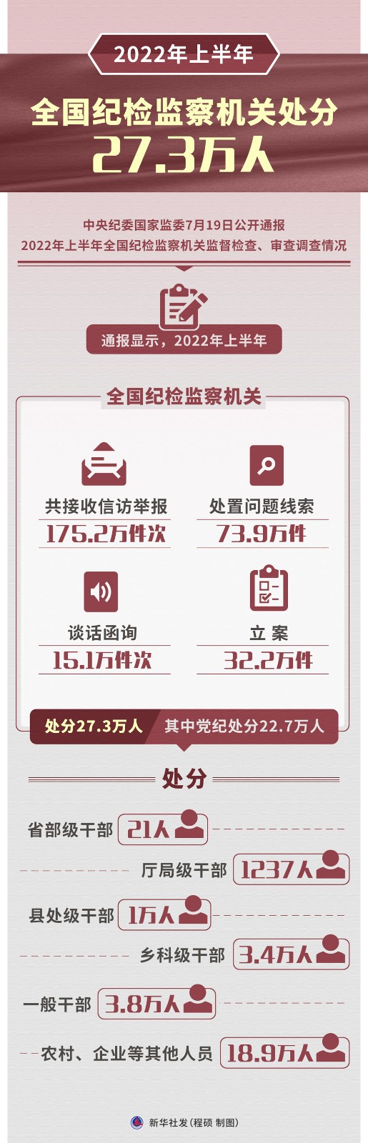 中央紀(jì)委國家監(jiān)委7月19日公開通報(bào)2022年上半年全國紀(jì)檢監(jiān)察機(jī)關(guān)監(jiān)督檢查、審查調(diào)查情況。2022年上半年,全國紀(jì)檢監(jiān)察機(jī)關(guān)共立案32.2萬件,處分27.3萬人,包括省部級(jí)干部21人。