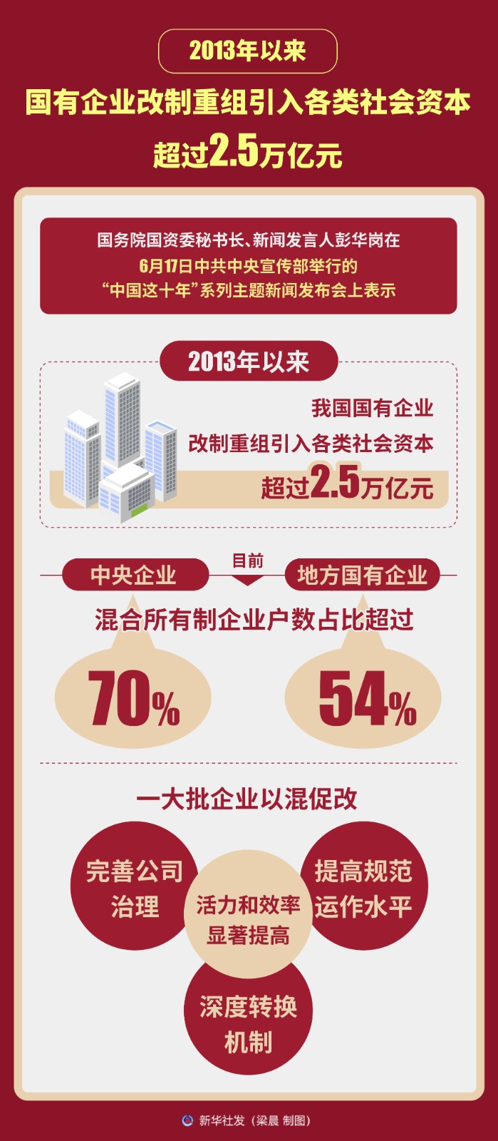 2013年以來,我國國有企業(yè)改制重組引入各類社會(huì)資本超過2.5萬億元,目前中央企業(yè)和地方國有企業(yè)中混合所有制企業(yè)戶數(shù)占比分別超過70%和54%。一大批企業(yè)以混促改,完善公司治理,提高規(guī)范運(yùn)作水平,深度轉(zhuǎn)換機(jī)制,活力和效率顯著提高。