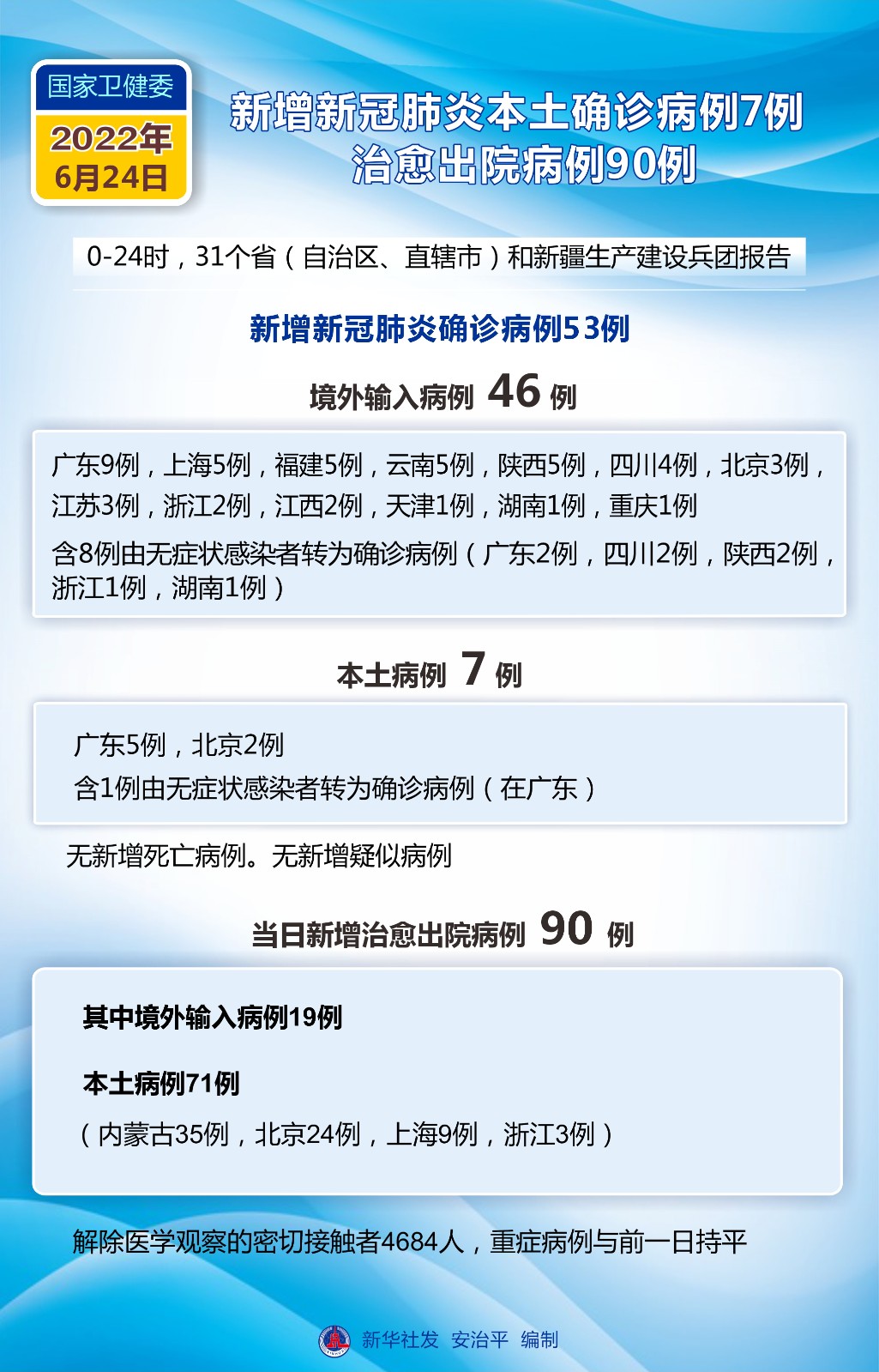 圖表:國(guó)家衛(wèi)健委:6月24日新增新冠肺炎本土確診病例7例 治愈出院病例90例