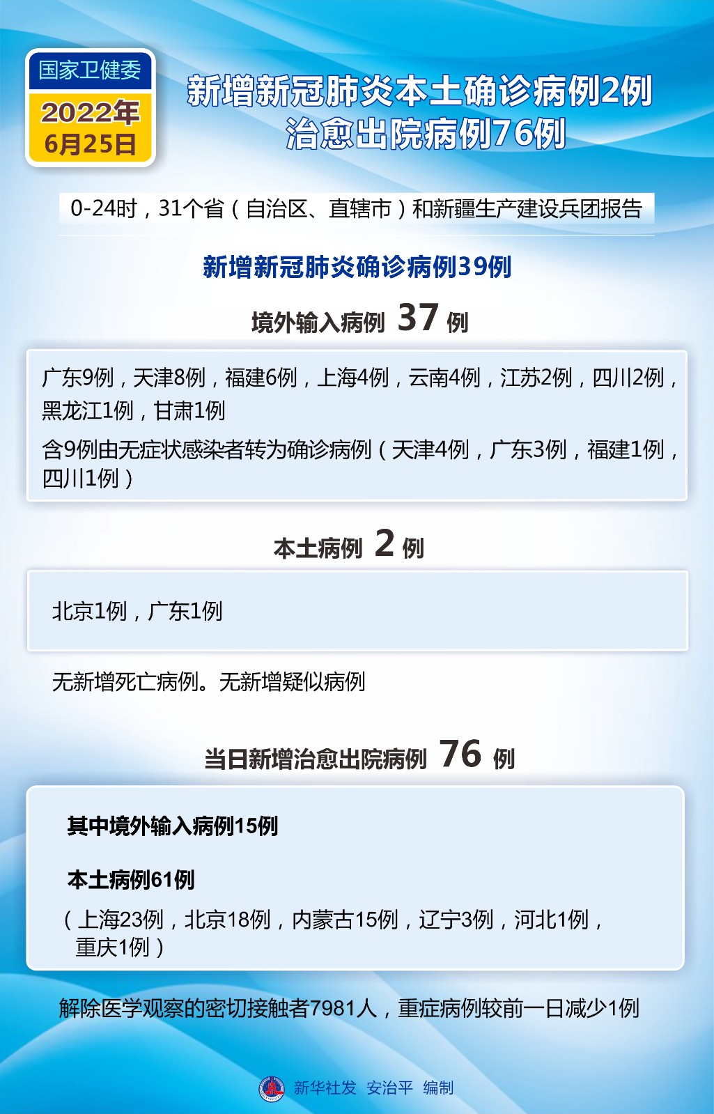 圖表:國(guó)家衛(wèi)健委:6月25日新增新冠肺炎本土確診病例2例 治愈出院病例76例