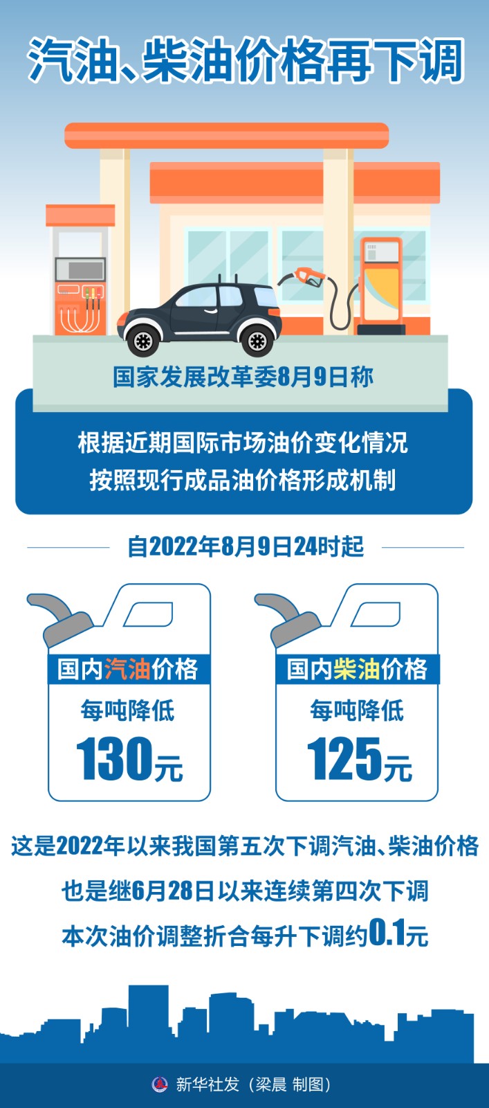 國家發(fā)展改革委8月9日稱,根據(jù)近期國際市場油價變化情況,按照現(xiàn)行成品油價格形成機(jī)制,自2022年8月9日24時起,國內(nèi)汽油、柴油價格每噸分別降低130元和125元。