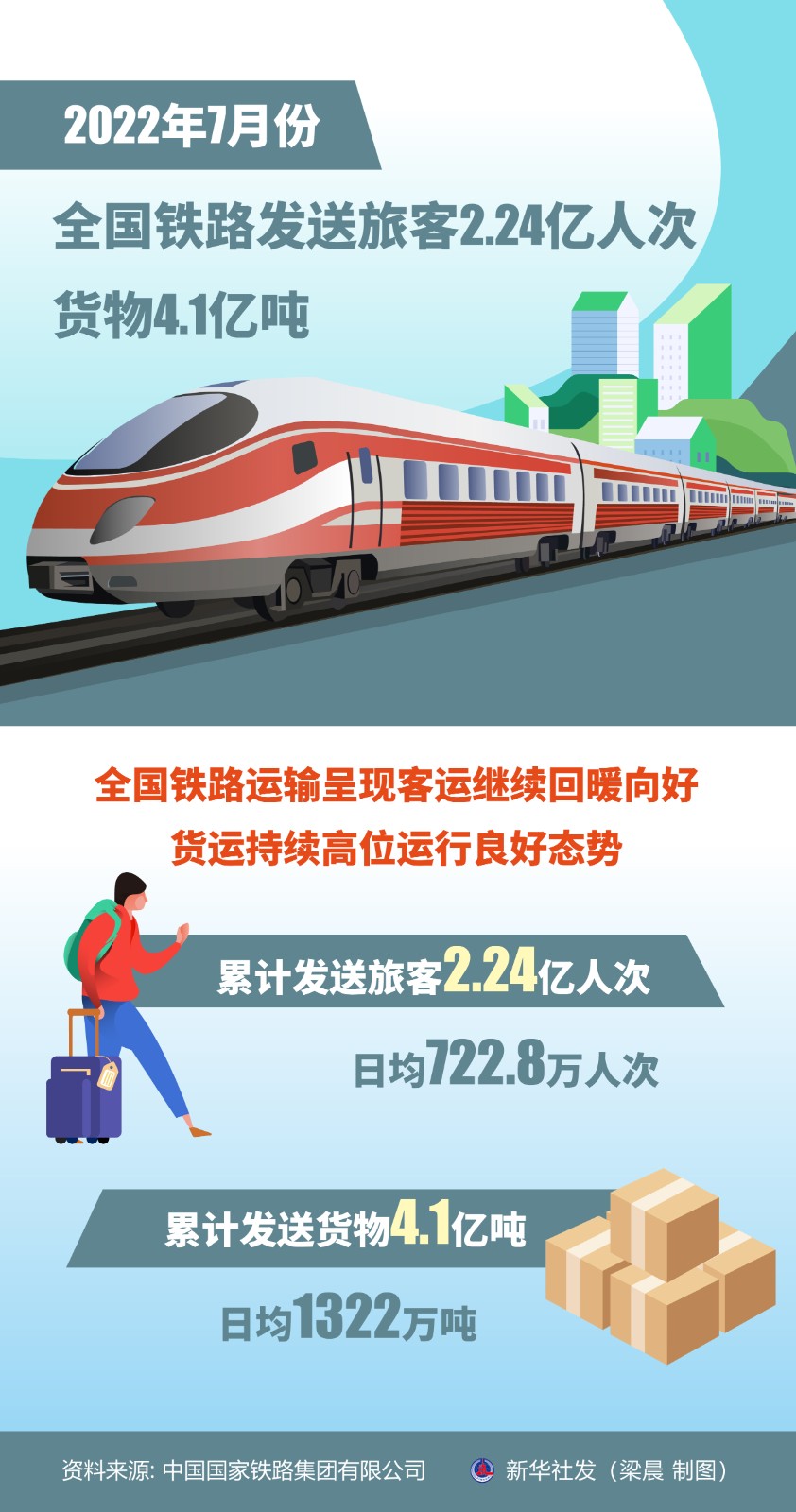 記者8月1日從中國國家鐵路集團有限公司獲悉,7月份,全國鐵路運輸呈現客運繼續(xù)回暖向好、貨運持續(xù)高位運行良好態(tài)勢,累計發(fā)送旅客2.24億人次,日均722.8萬人次;累計發(fā)送貨物4.1億噸,日均1322萬噸。