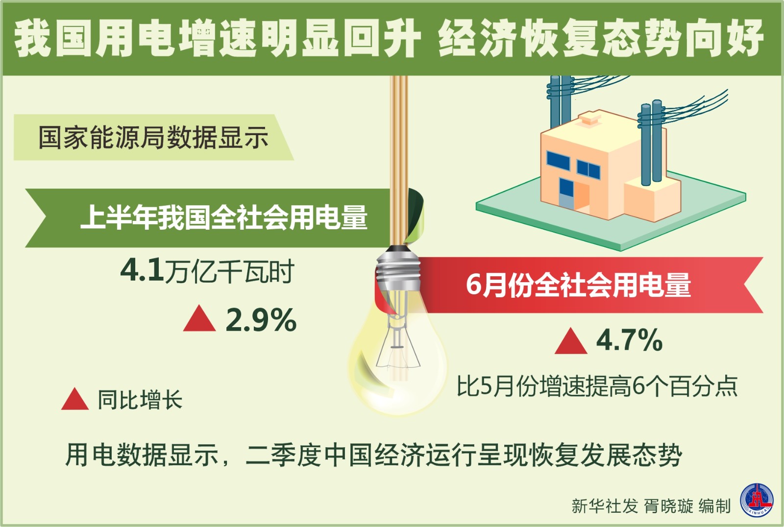 國(guó)家能源局?jǐn)?shù)據(jù)顯示,上半年我國(guó)全社會(huì)用電量4.1萬億千瓦時(shí),同比增長(zhǎng)2.9%。6月份全社會(huì)用電量同比增長(zhǎng)4.7%,比5月份增速提高6個(gè)百分點(diǎn)。用電數(shù)據(jù)顯示,二季度中國(guó)經(jīng)濟(jì)運(yùn)行呈現(xiàn)恢復(fù)發(fā)展態(tài)勢(shì)。