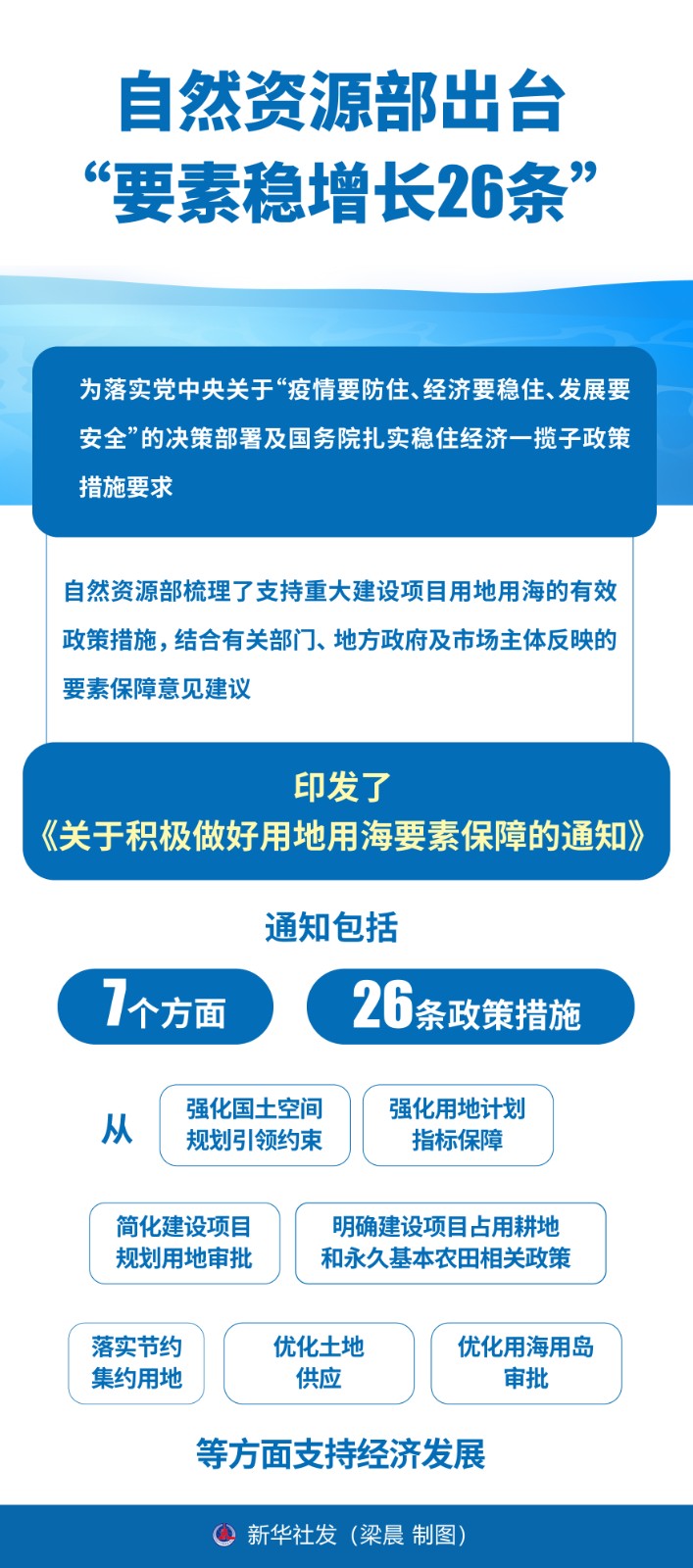 新華社記者8月8日在自然資源部新聞通氣會上獲悉,為落實黨中央關于“疫情要防住、經(jīng)濟要穩(wěn)住、發(fā)展要安全”的決策部署及國務院扎實穩(wěn)住經(jīng)濟一攬子政策措施要求,自然資源部梳理了支持重大建設項目用地用海的有效政策措施,結(jié)合有關部門、地方政府及市場主體反映的要素保障意見建議,印發(fā)了《關于積極做好用地用海要素保障的通知》,通知包括7個方面26條政策措施,從強化國土空間規(guī)劃引領約束、強化用地計劃指標保障、簡化建設項目規(guī)劃用地審批、明確建設項目占用耕地和永久基本農(nóng)田相關政策、落實節(jié)約集約用地、優(yōu)化土地供應、優(yōu)化用海用島審批等方面支持經(jīng)濟發(fā)展。