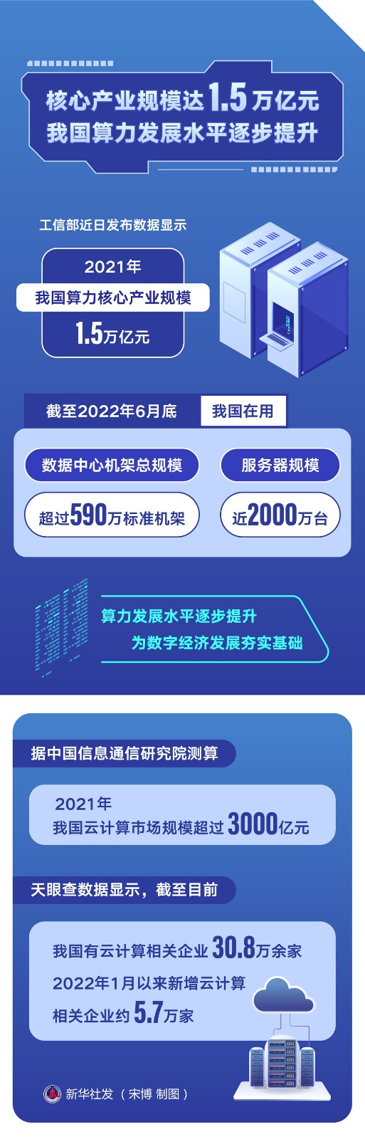 工信部近日發(fā)布數(shù)據(jù)顯示,2021年,我國算力核心產(chǎn)業(yè)規(guī)模達(dá)1.5萬億元。截至2022年6月底,我國在用數(shù)據(jù)中心機架總規(guī)模超過590萬標(biāo)準(zhǔn)機架,服務(wù)器規(guī)模近2000萬臺。算力發(fā)展水平逐步提升,為數(shù)字經(jīng)濟發(fā)展夯實基礎(chǔ)。