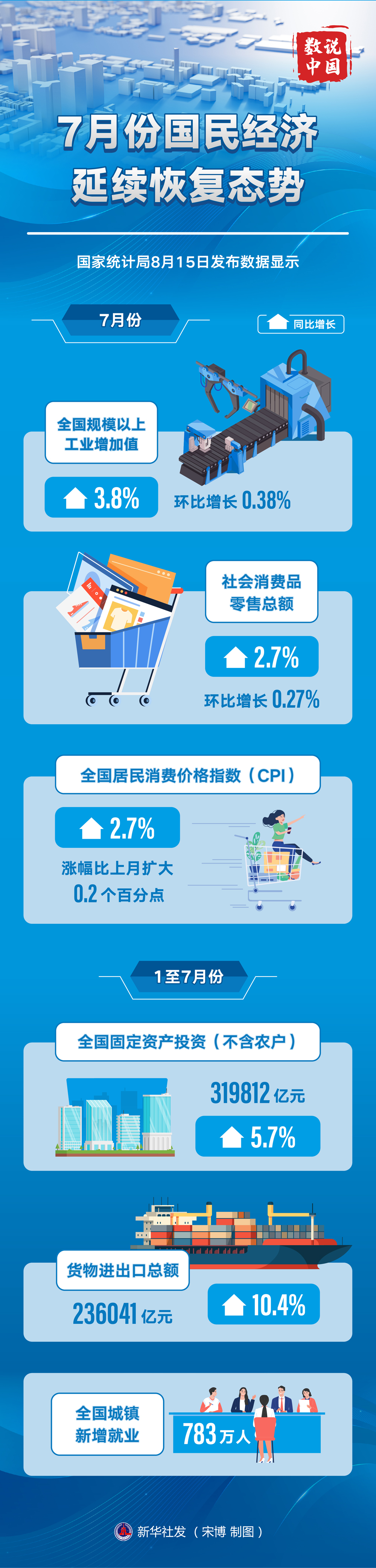 國家統(tǒng)計局8月15日發(fā)布數(shù)據(jù)顯示,7月份,生產(chǎn)供給繼續(xù)恢復(fù),就業(yè)物價總體平穩(wěn),對外貿(mào)易增勢良好,民生保障有力有效,國民經(jīng)濟延續(xù)恢復(fù)態(tài)勢。