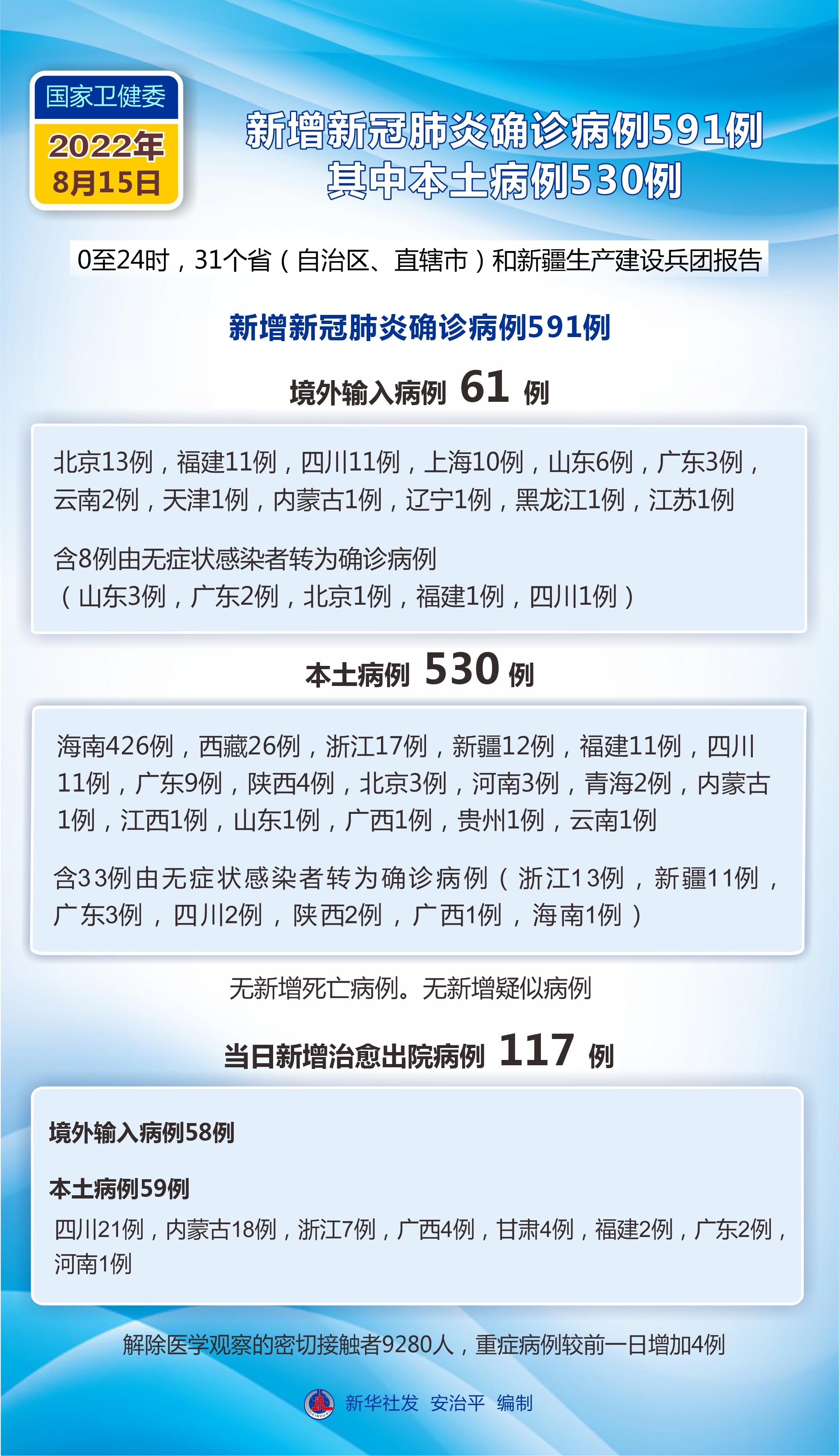 國家衛(wèi)生健康委員會8月16日通報,8月15日0至24時,31個?。ㄗ灾螀^(qū)、直轄市)和新疆生產(chǎn)建設兵團報告新增新冠肺炎確診病例591例。
