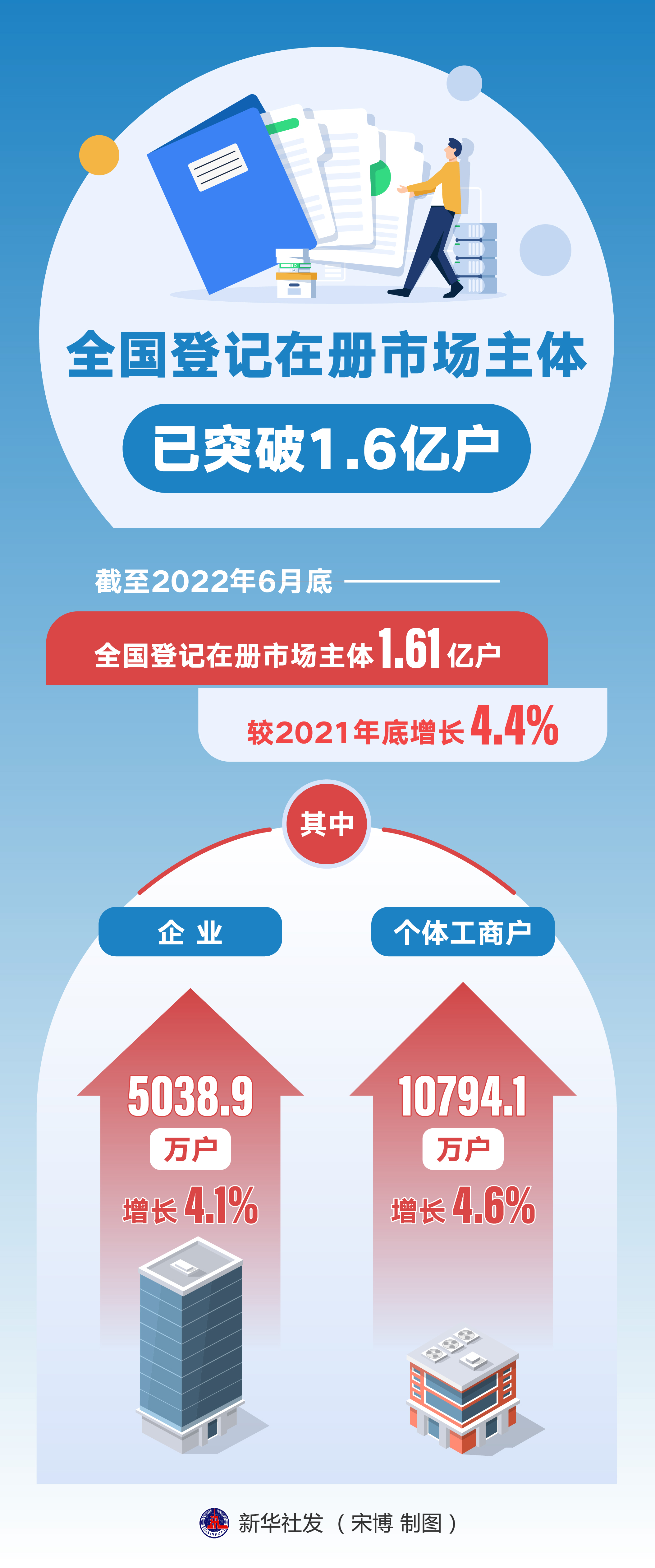 截至2022年6月底,全國(guó)登記在冊(cè)市場(chǎng)主體1.61億戶,較2021年底增長(zhǎng)4.4%。其中企業(yè)5038.9萬戶,增長(zhǎng)4.1%;個(gè)體工商戶10794.1萬戶,增長(zhǎng)4.6%。