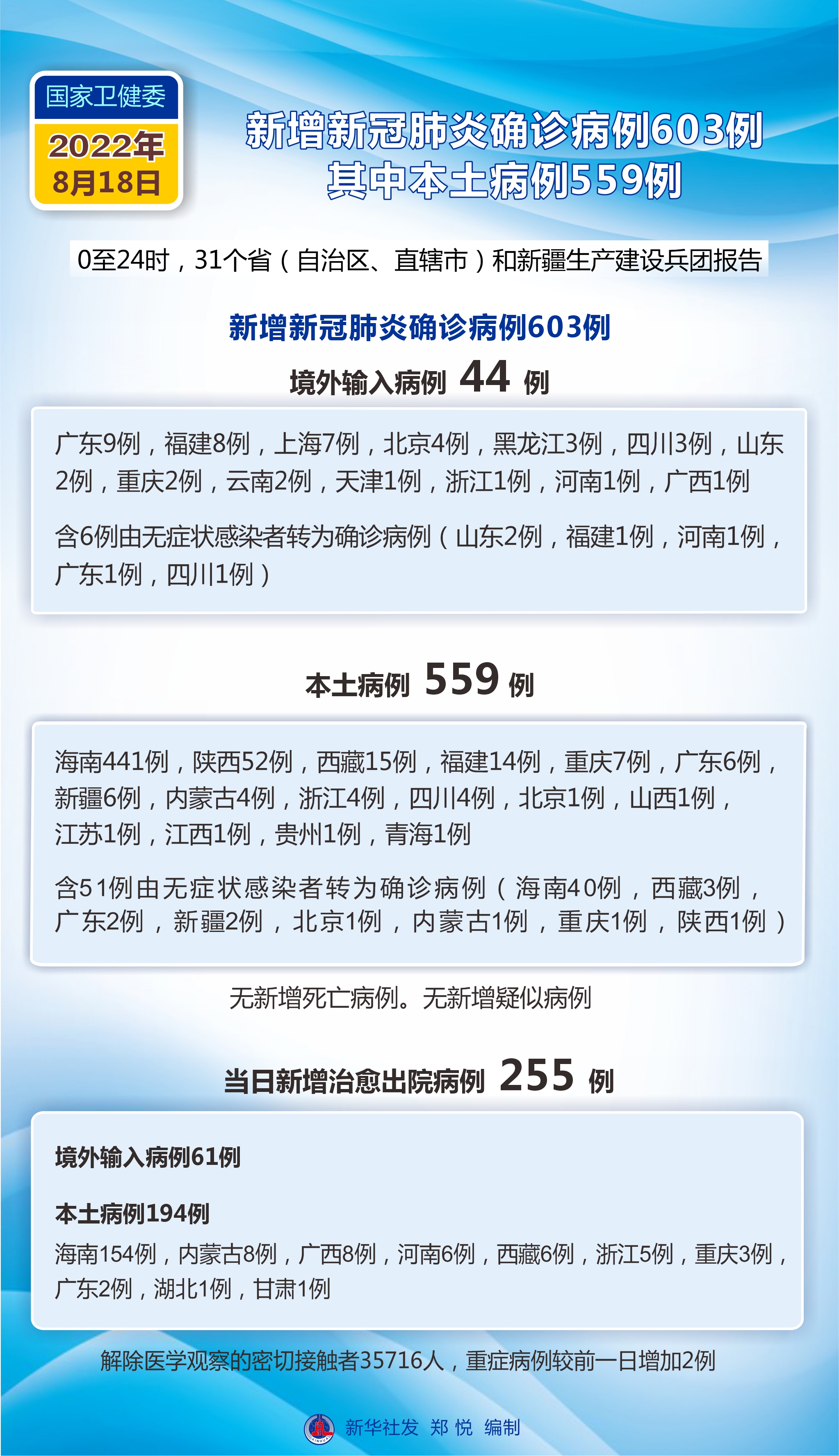 國家衛(wèi)健委:8月18日新增新冠肺炎確診病例603例 其中本土病例559例