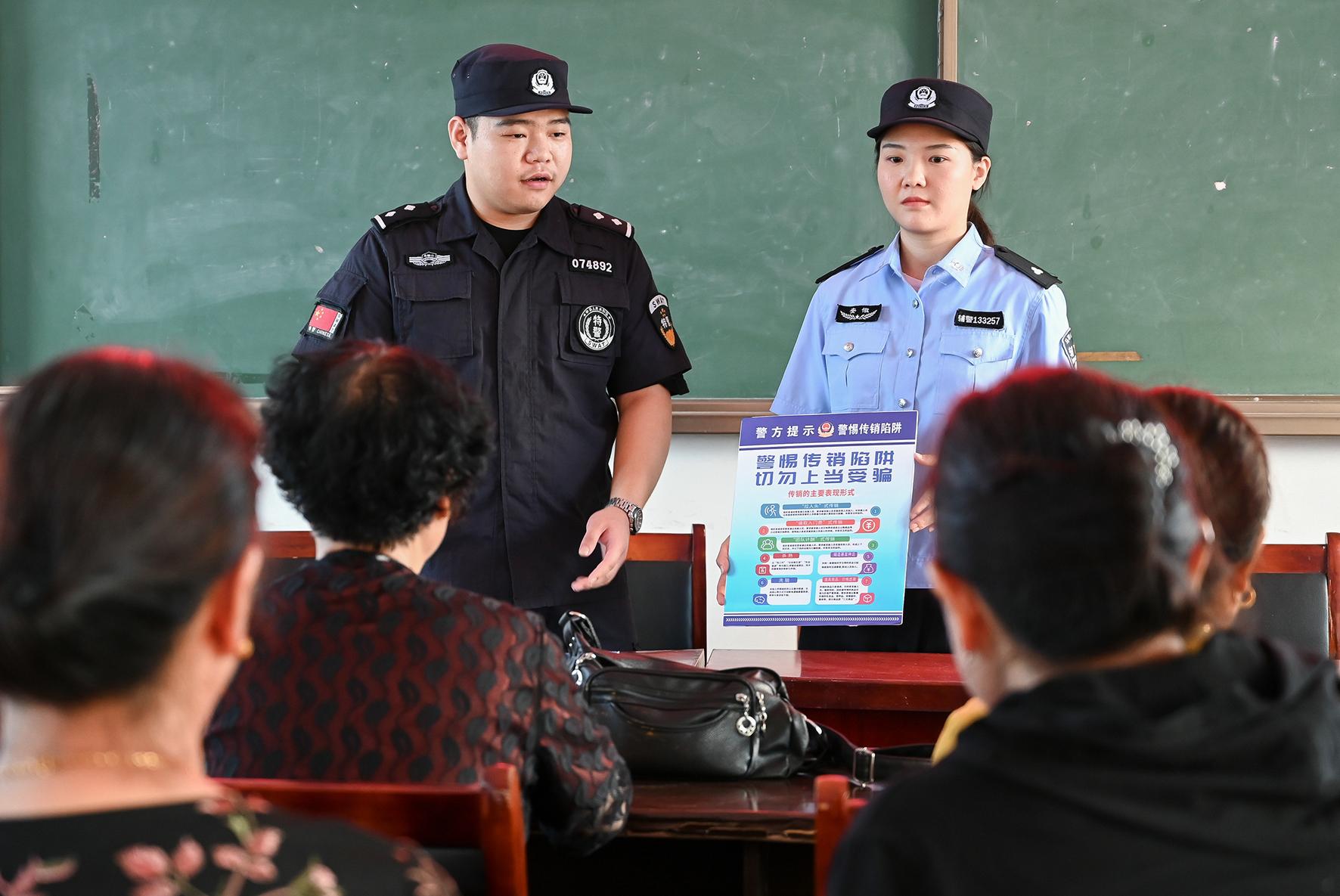 8月20日,安徽省和縣公安局經(jīng)偵大隊(duì)民警在白橋鎮(zhèn)老年大學(xué)開展反傳銷宣傳。