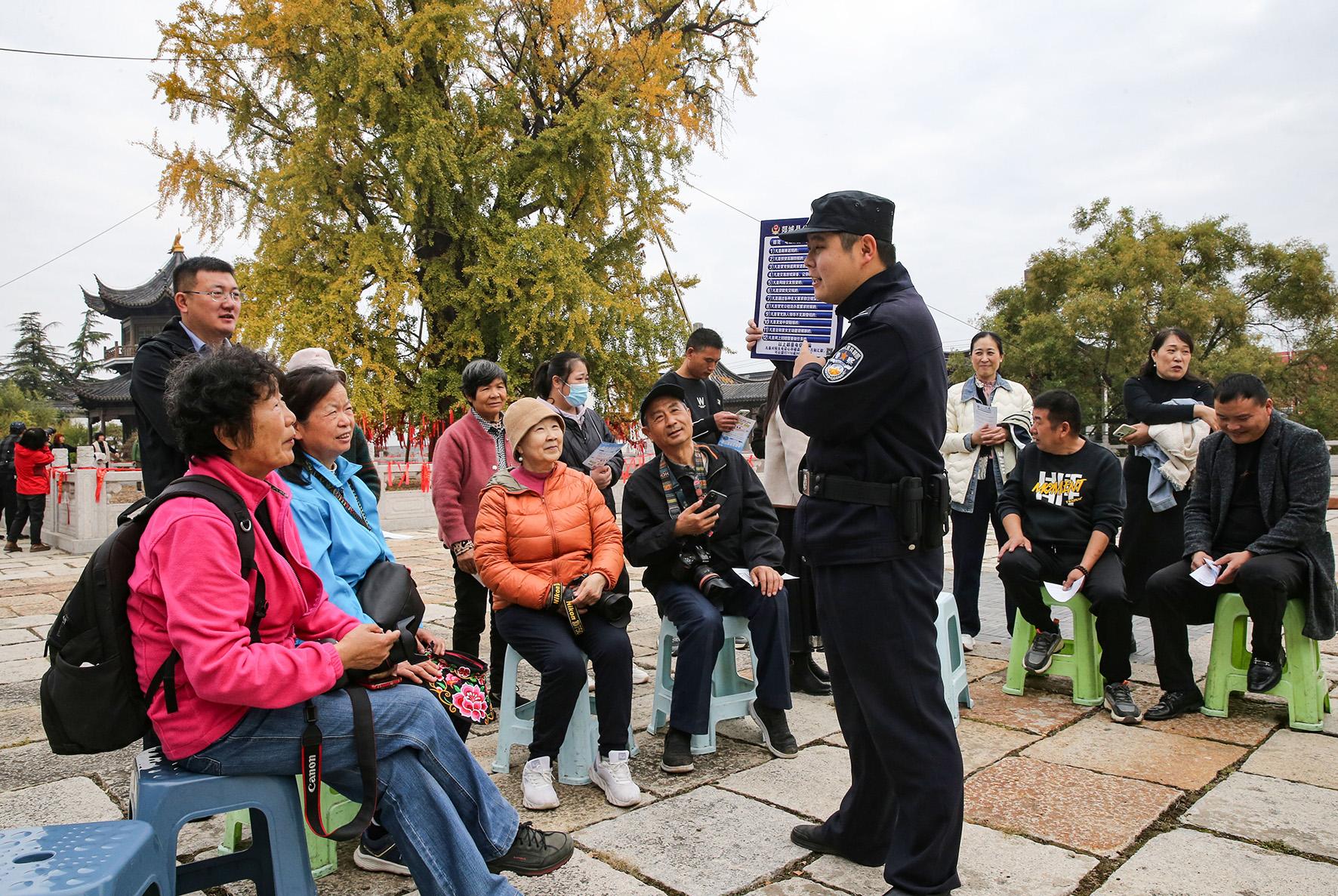 11月10日,山東省臨沂市郯城縣公安局新村派出所民警走進新村三千年古銀杏樹景區(qū),向游客宣講反詐知識。
