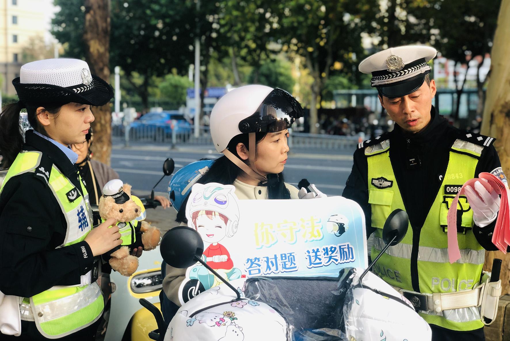 “您知道騎電動車要戴安全頭盔嗎?”11月12日,安徽省蕪湖市公安局交警支隊鏡湖大隊民輔警來到轄區(qū)北塘小學(xué)向家長和小朋友們開展“答對題 送獎勵”交通安全宣傳活動。