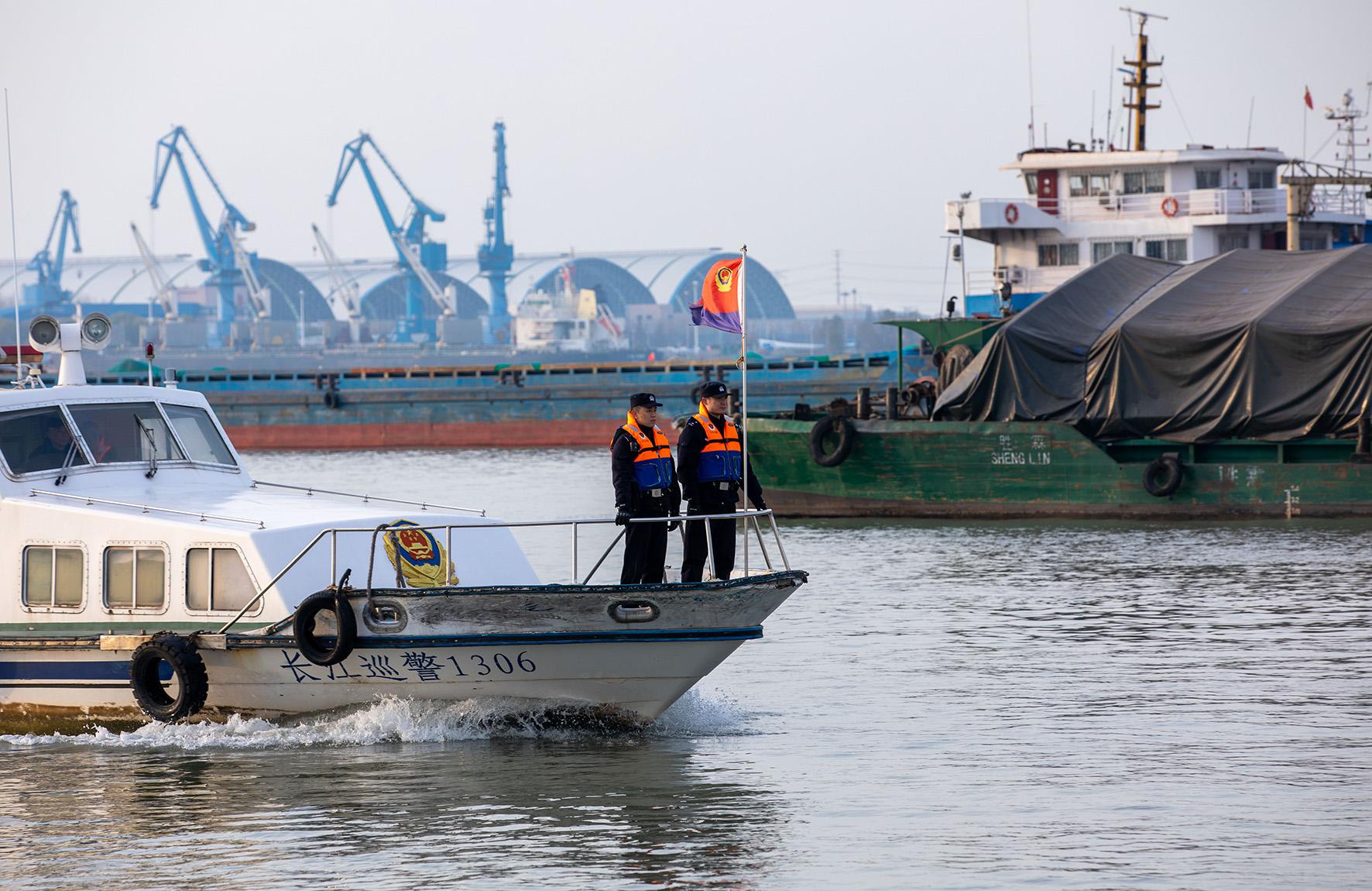 圖為12月22日,民警在長(zhǎng)江江蘇鎮(zhèn)江段水域開(kāi)展水上巡邏。