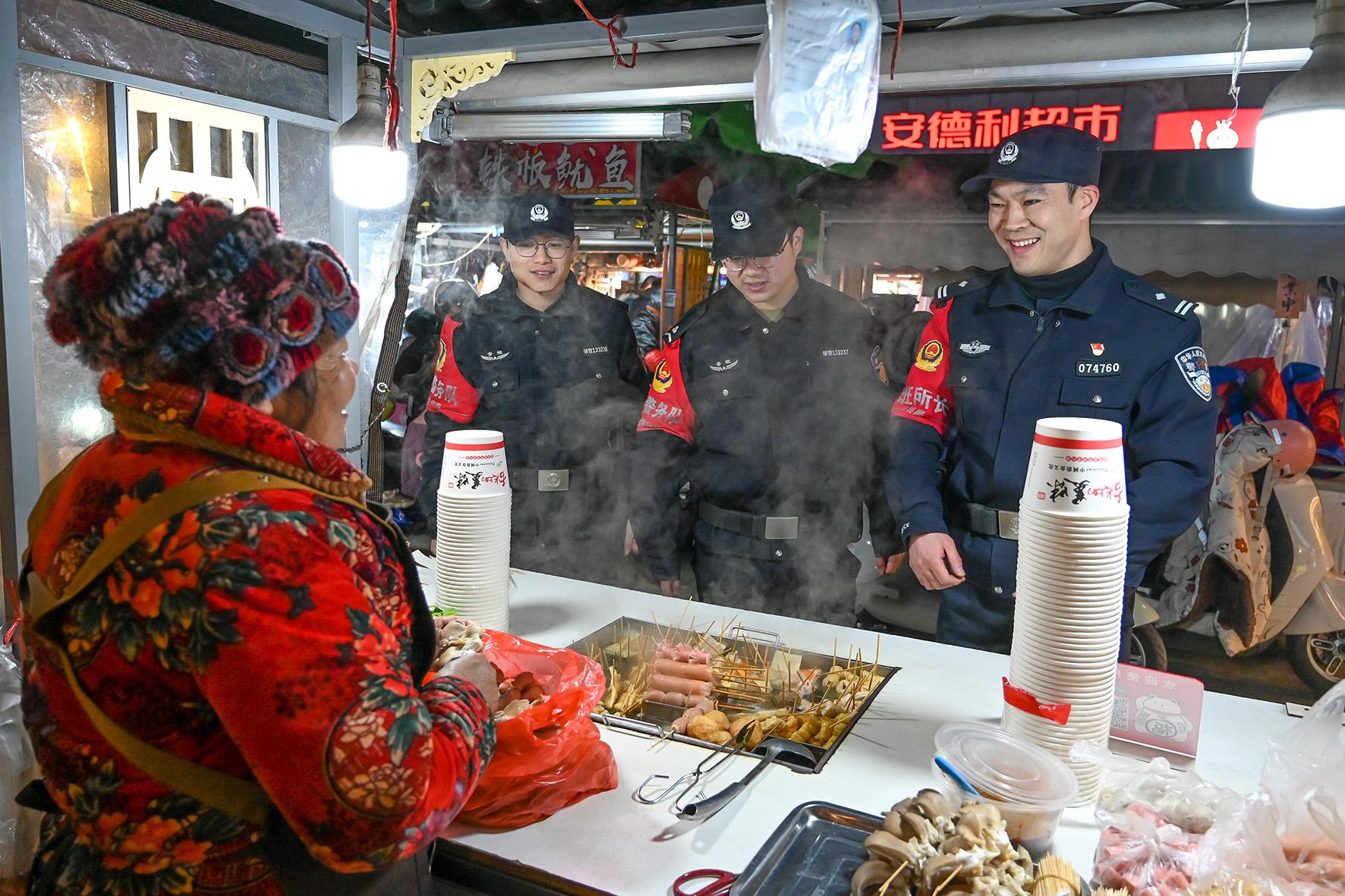 1月13日晚,安徽省馬鞍山市和縣公安局民警在美食街開(kāi)展徒步巡邏,走訪經(jīng)營(yíng)戶(hù)了解治安狀況,守護(hù)夜市平安。