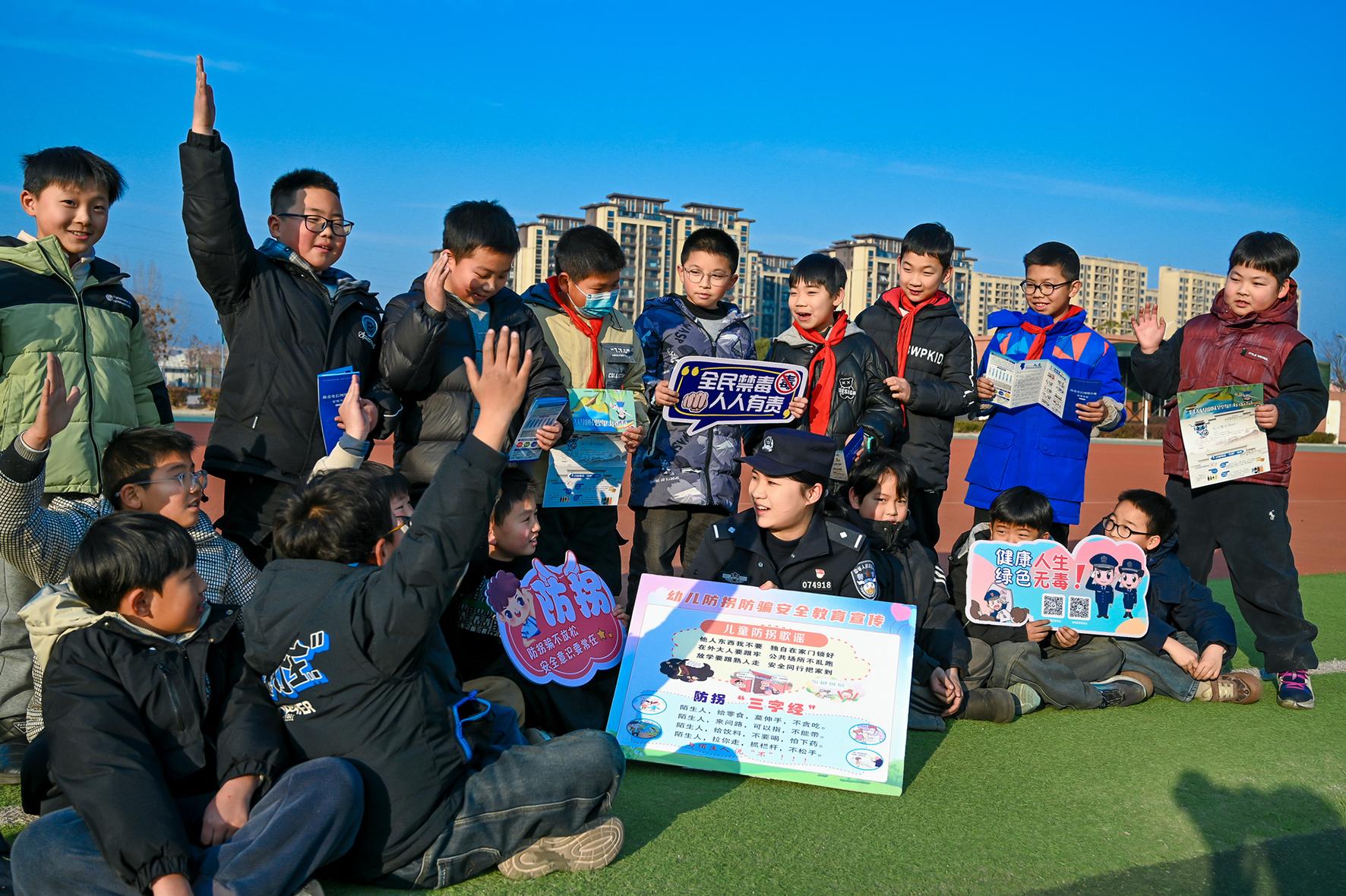 1月14日,在安徽省馬鞍山市和縣實驗小學(xué),轄區(qū)歷陽派出所民警在給學(xué)生講解防拐、防騙、交通安全等知識。寒假來臨,該縣公安機關(guān)及時開展“假前最后一課”宣傳活動。