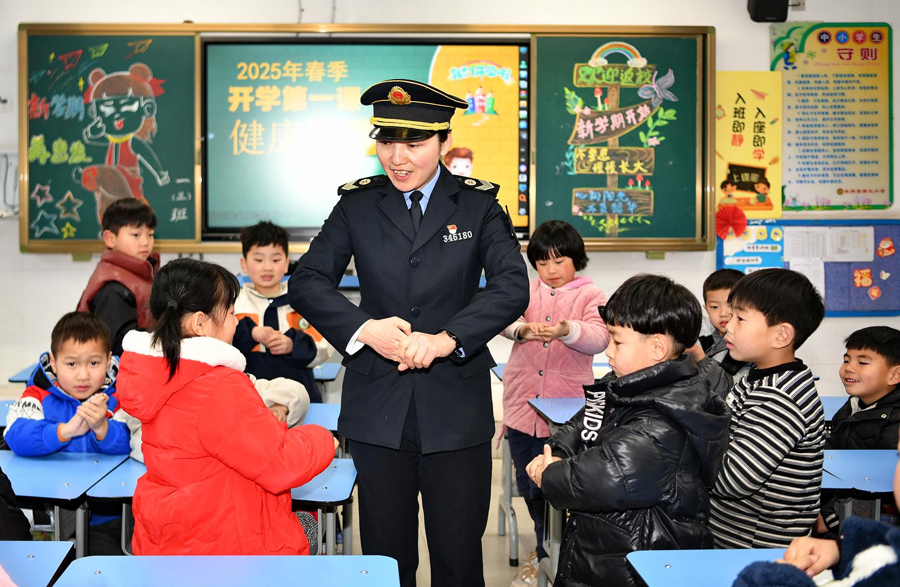 2月14日,安徽省阜南縣衛(wèi)生監(jiān)督員在第三小學(xué)向?qū)W生們講解學(xué)校衛(wèi)生知識(shí)。春季開(kāi)學(xué)之際,阜南縣疾病預(yù)防控制局組織監(jiān)督員走進(jìn)轄區(qū)中小學(xué)校開(kāi)展傳染病防控、預(yù)防近視和勤洗手等學(xué)生衛(wèi)生知識(shí)宣講,增強(qiáng)學(xué)生們自我健康防護(hù)意識(shí)。