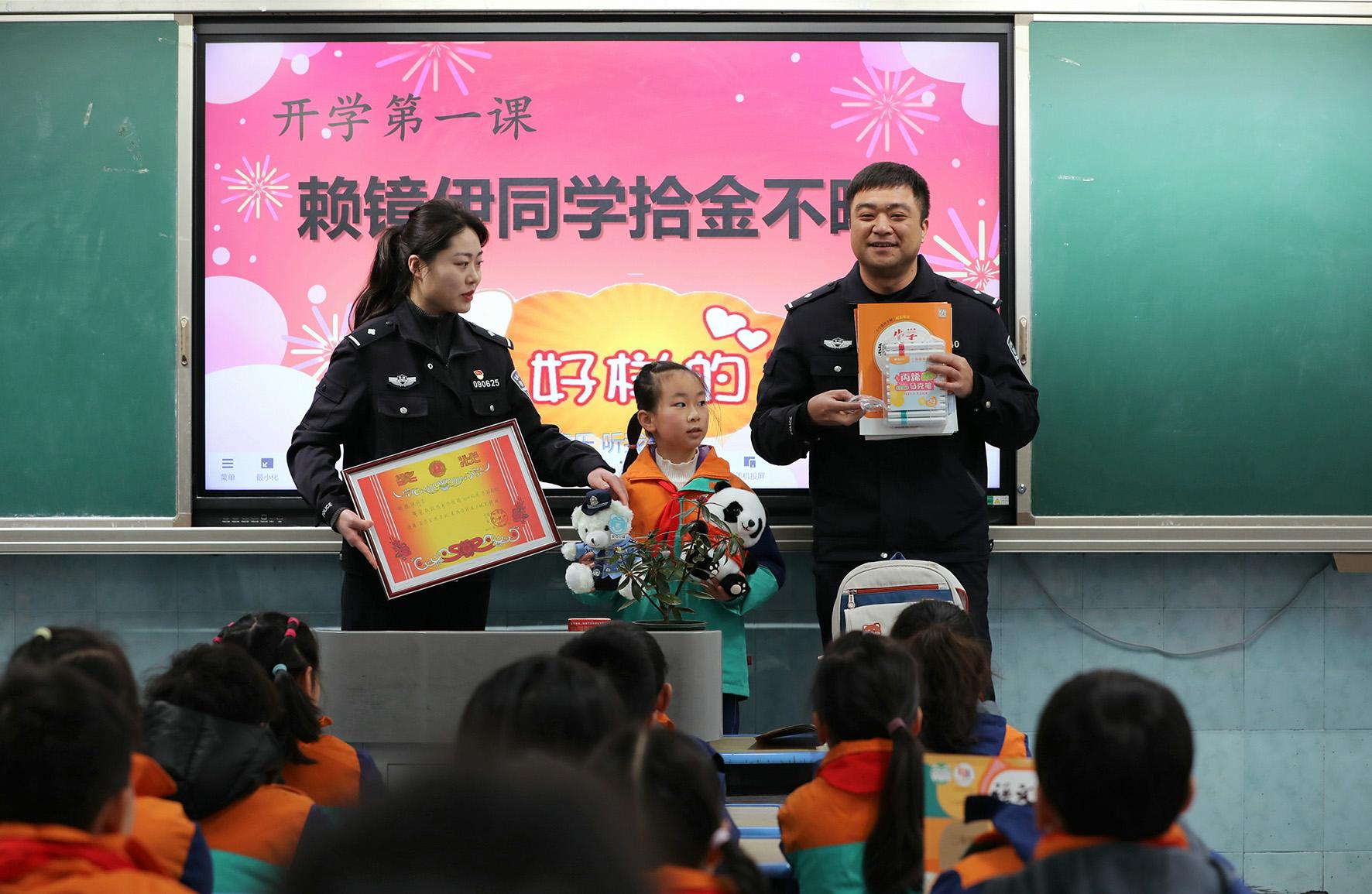 2月14日,安徽省寧國(guó)市公安局西津派出所借助開(kāi)學(xué)“第一課”開(kāi)展“送獎(jiǎng)進(jìn)課堂”思政教育。民警在表?yè)P(yáng)拾金不昧學(xué)生的同時(shí),教育引導(dǎo)同學(xué)們要傳承弘揚(yáng)中華民族傳統(tǒng)美德,爭(zhēng)做新時(shí)代好少年。