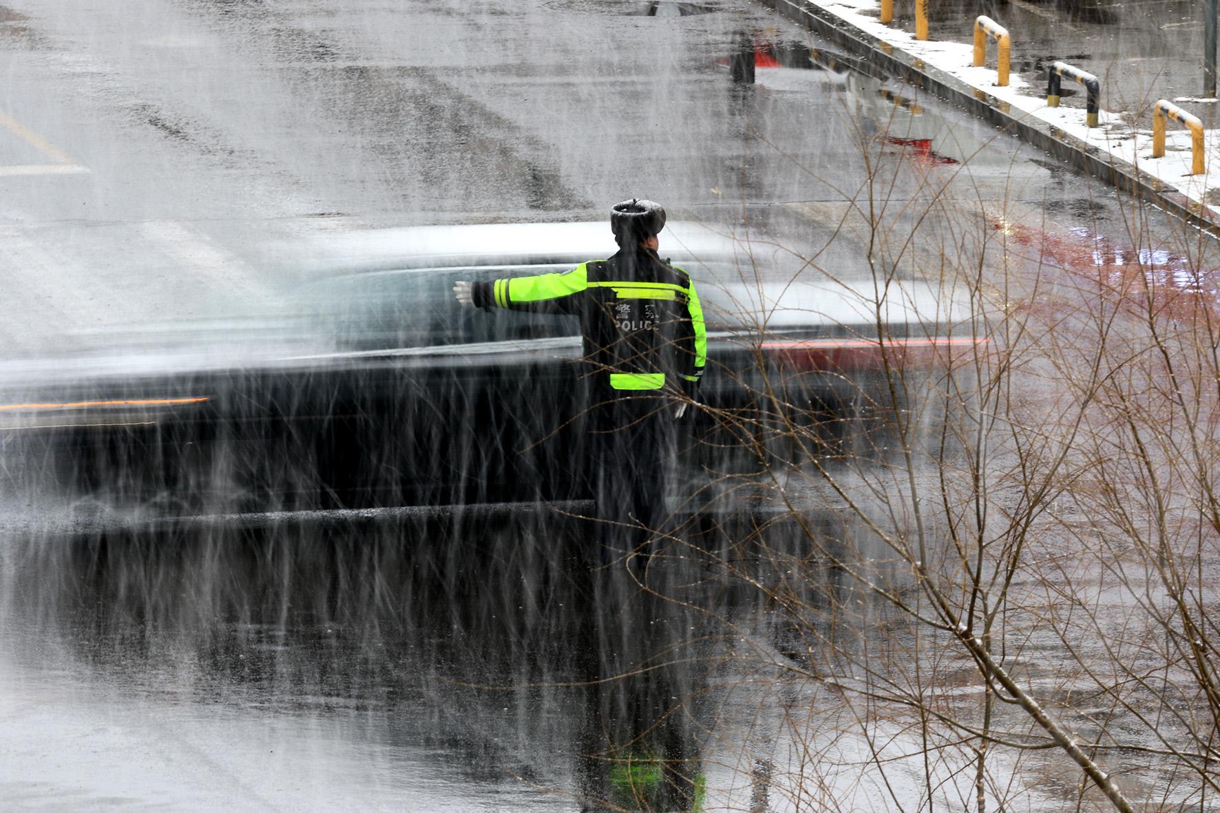 3月17日,遼寧省阜新市出現(xiàn)降雪天氣。阜新市公安局交通警察支隊(duì)細(xì)河交警大隊(duì)組織警力加大路面管控和指揮疏導(dǎo)力度,確保群眾平安出行。