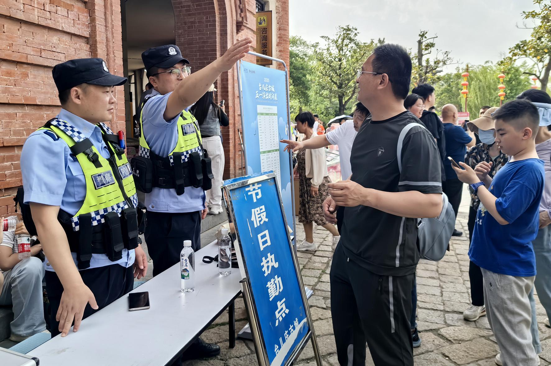 5月5日,山東省棗莊市公安局臺(tái)兒莊分局民輔警在臺(tái)兒莊古城執(zhí)勤。