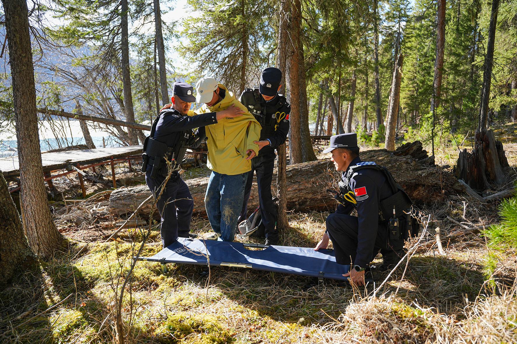 5月2日,新疆阿勒泰邊境管理支隊(duì)喀納斯邊境派出所民警在喀納斯吐魯克巖畫(huà)附近救援摔傷游客。