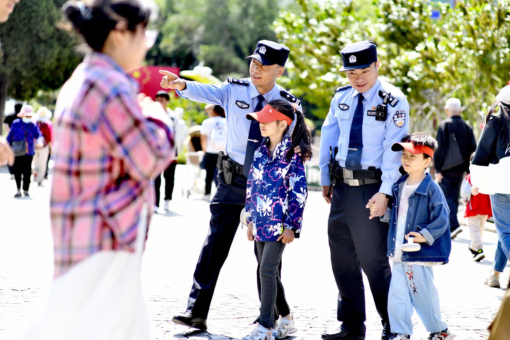 5月1日,山東省濟(jì)南市公安局市中區(qū)分局濼源派出所民警幫助一名3歲男孩找到走散的家人。