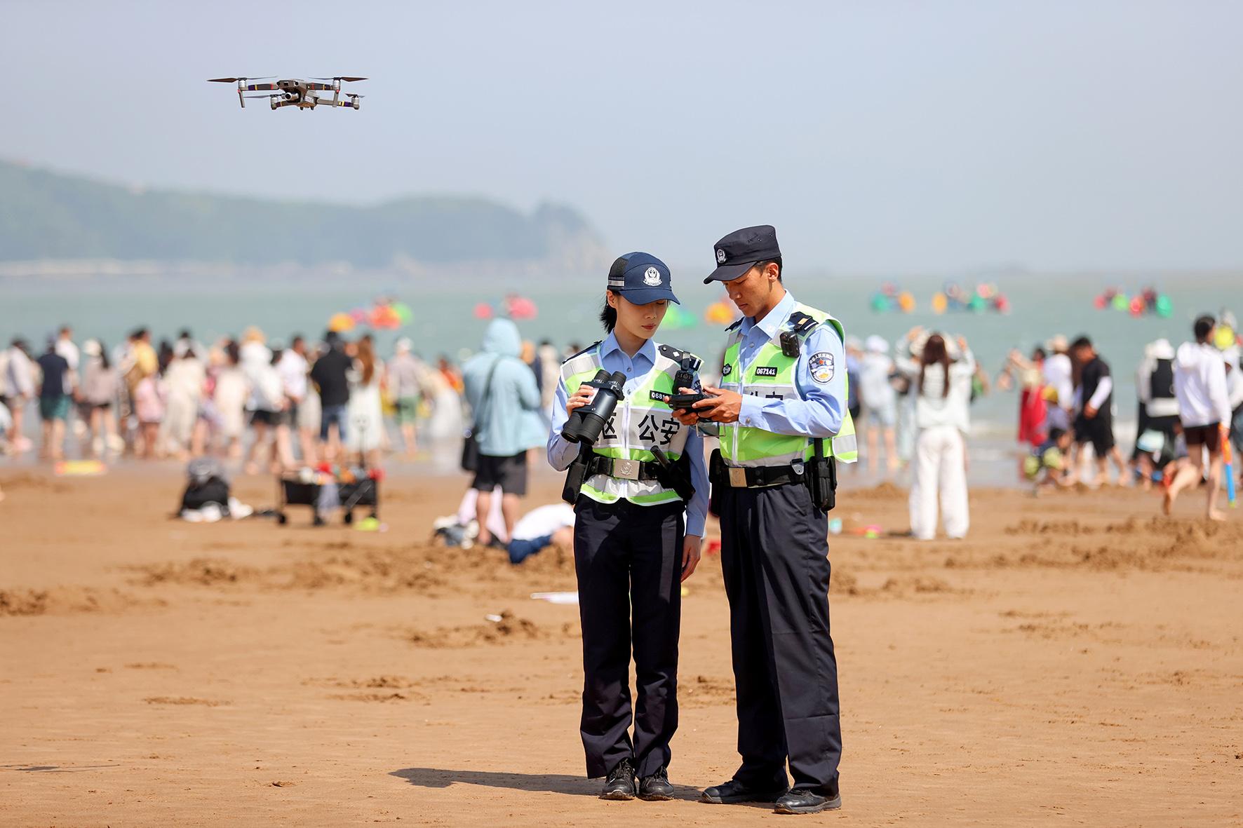 5月4日,浙江省舟山市公安局普陀山分局朱家尖派出所民警堅(jiān)守在轄區(qū)景區(qū)一線(xiàn),開(kāi)展巡邏執(zhí)勤、無(wú)人機(jī)空中巡查等工作,守護(hù)游客平安。