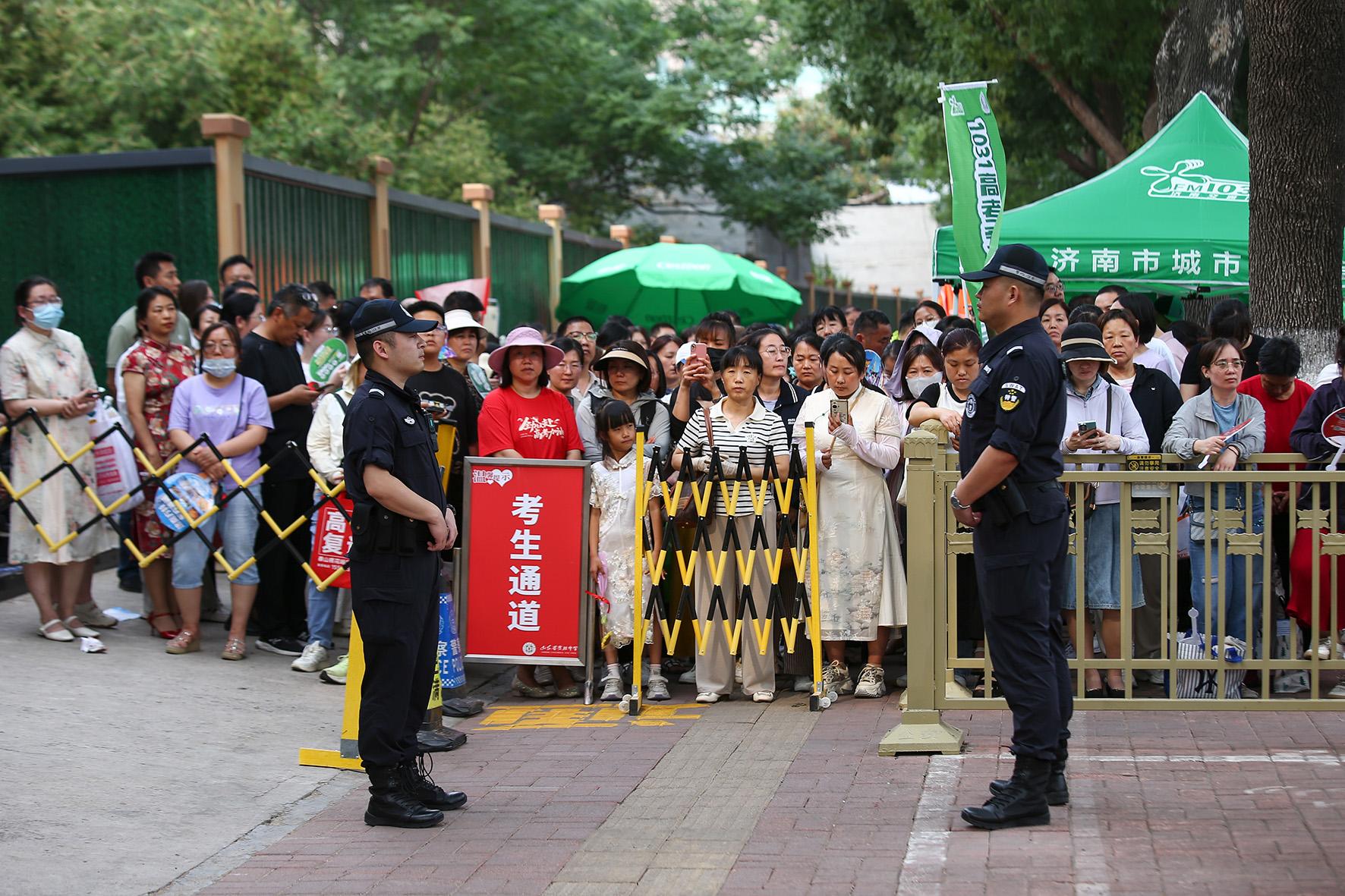 6月7日,在山東省實(shí)驗(yàn)中學(xué)考點(diǎn),濟(jì)南市公安局市中區(qū)分局桿石橋派出所執(zhí)勤民警引導(dǎo)考生有序進(jìn)場(chǎng)。