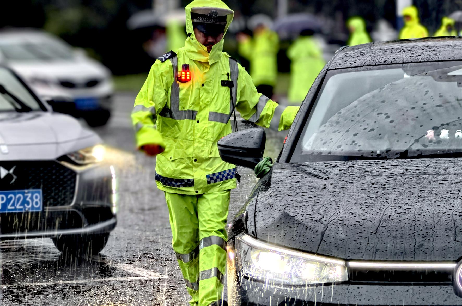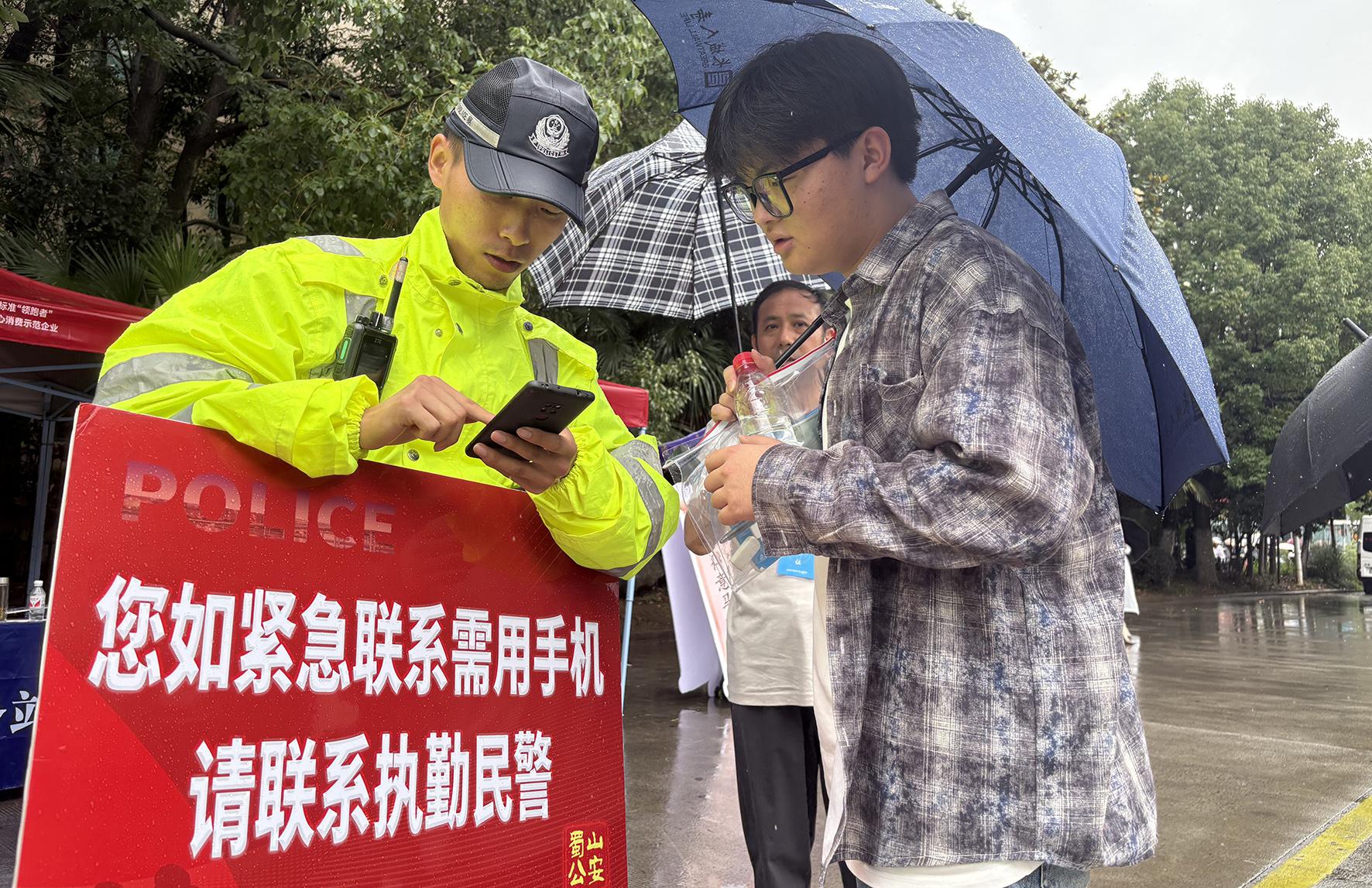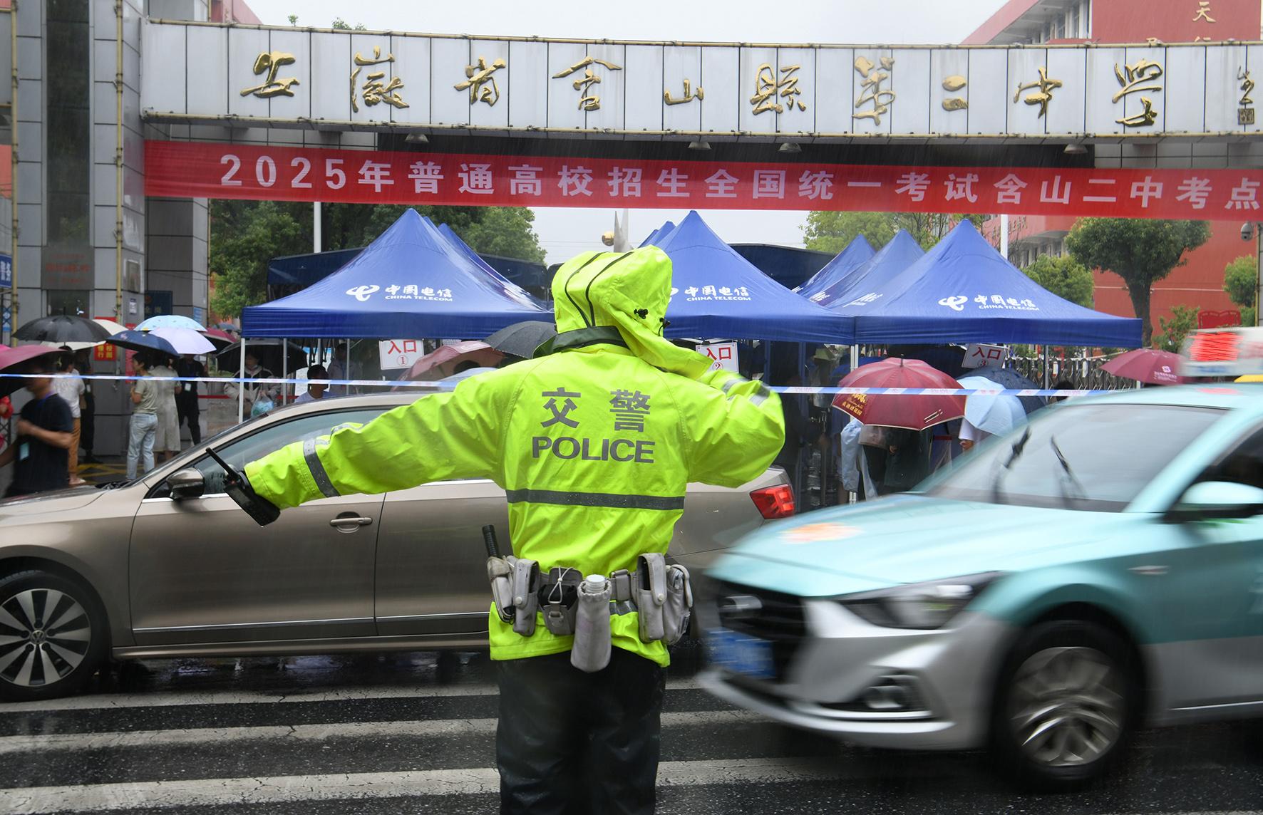 6月7日,安徽省當(dāng)涂縣突降大雨。當(dāng)涂縣公安局組織警力在考場(chǎng)周邊開展交通疏導(dǎo)、緊急救助、為民服務(wù)等工作,為考生們營(yíng)造良好的考試環(huán)境。