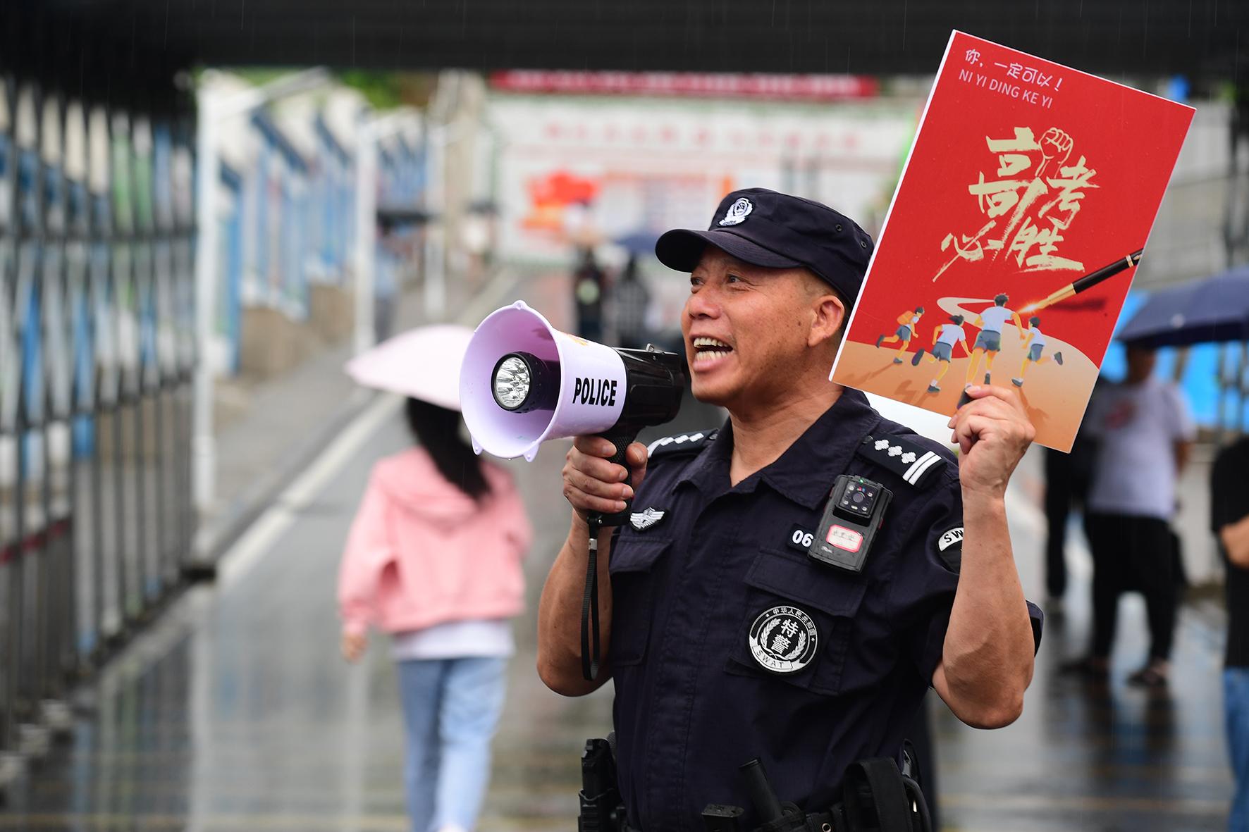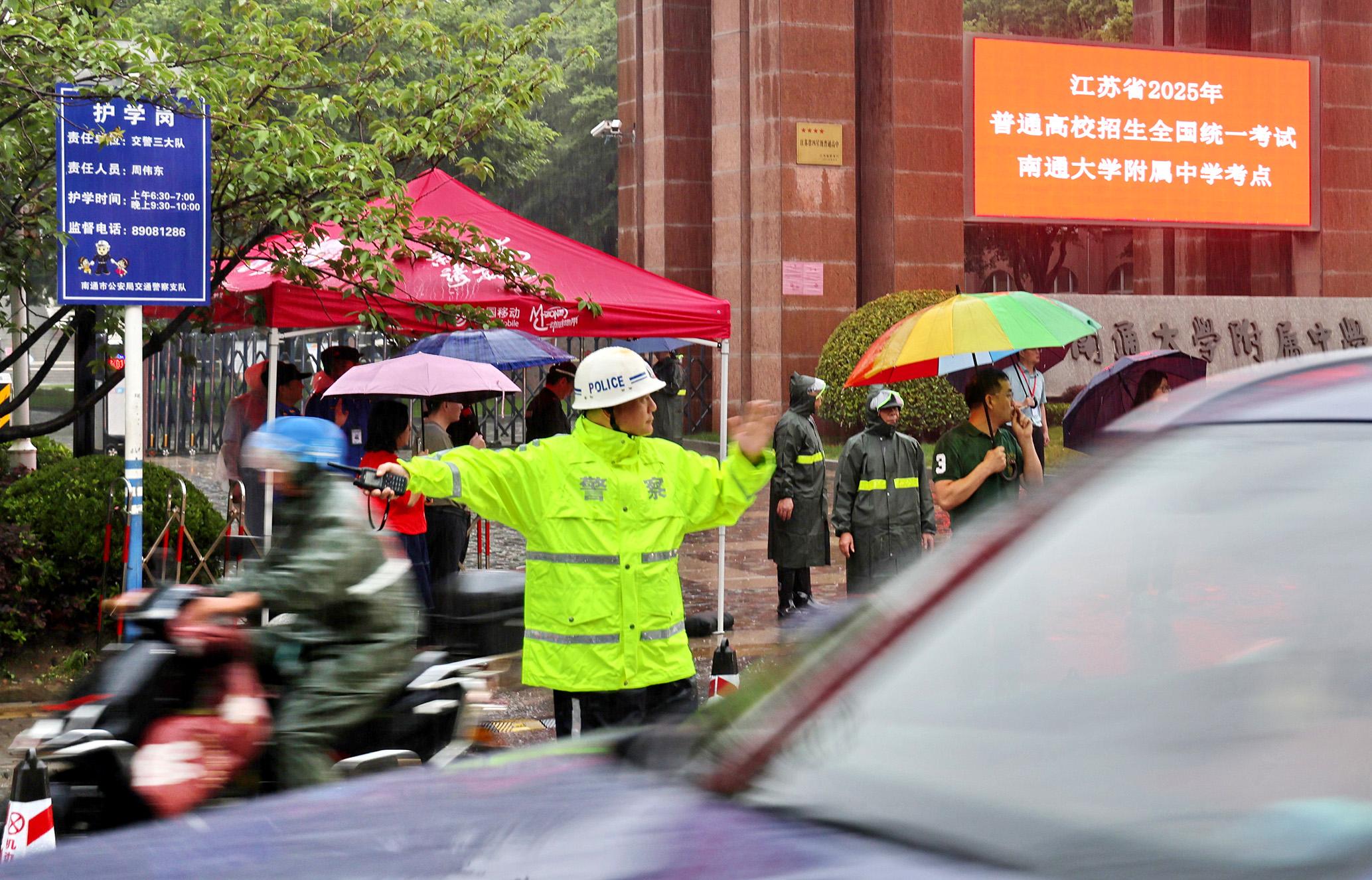 6月7日,江蘇省南通市在雨中迎來高考。南通市公安局民警全警動(dòng)員,堅(jiān)守崗位,護(hù)航學(xué)子圓夢(mèng)。