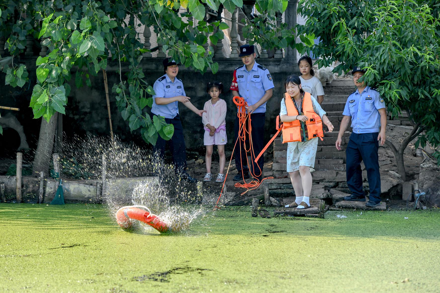 7月6日,在安徽省馬鞍山市和縣歷陽(yáng)鎮(zhèn)萬(wàn)壽村,和縣公安局“村警”向未成年人講解“防溺水”知識(shí),傳授救生設(shè)備的使用方法。