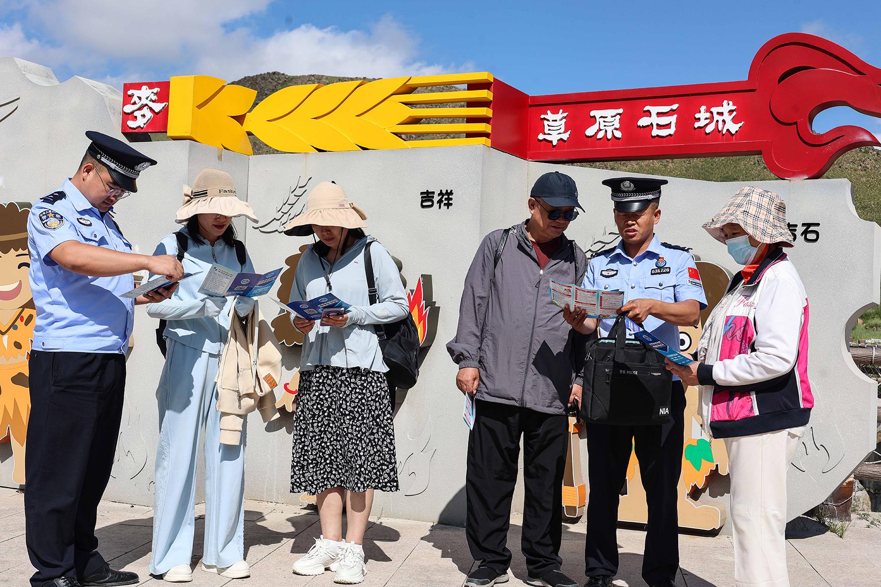 7月9日,新疆阿勒泰邊境管理支隊托斯特邊境派出所民警走進轄區(qū)草原神石城景區(qū),向游客普及防范電信網(wǎng)絡(luò)詐騙知識。