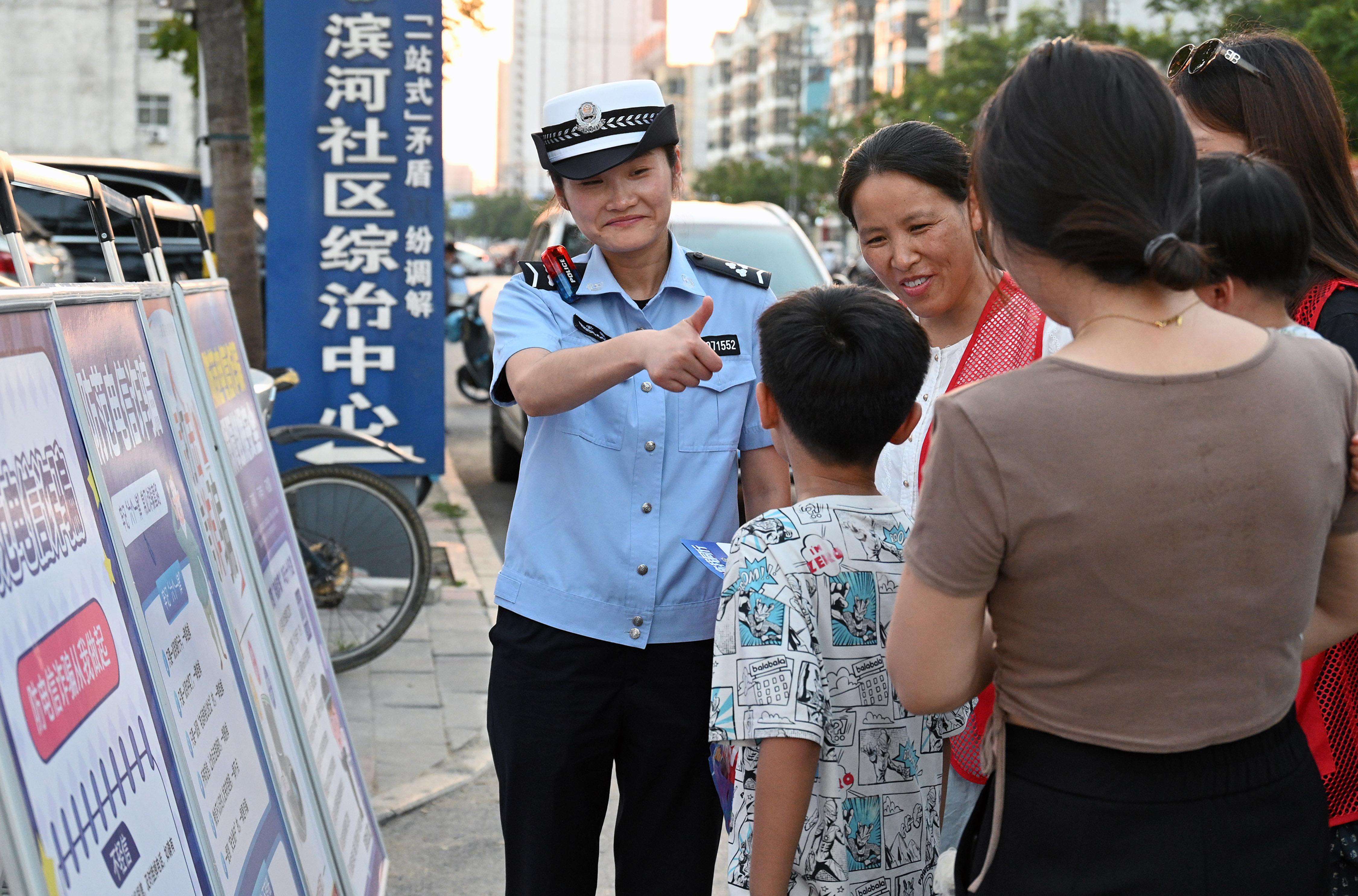 8月18日,安徽省固鎮(zhèn)縣公安局交管大隊(duì)輔警在濱河社區(qū)向居民普及安全防范知識(shí)。固鎮(zhèn)縣公安局創(chuàng)新探索“警街聯(lián)動(dòng)”模式,聯(lián)合街道、社區(qū)開展交通安全、反詐宣傳和服務(wù)群眾等工作。