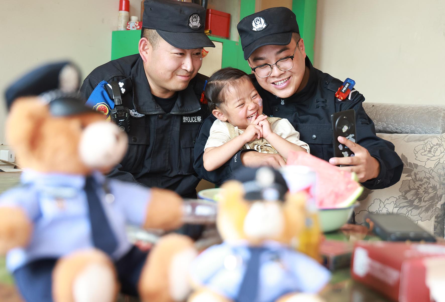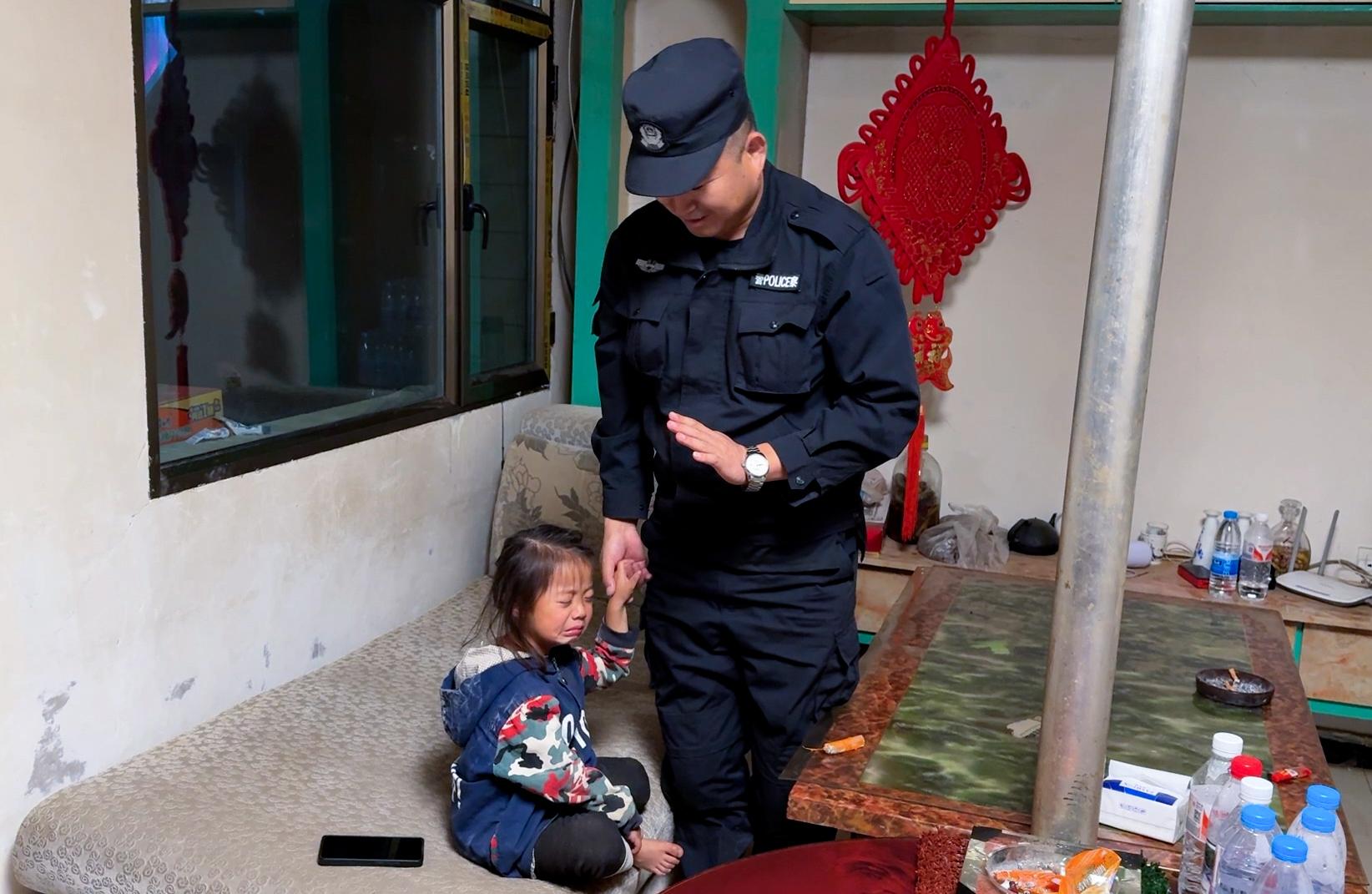 當(dāng)晚,民警們要輪崗去其他點(diǎn)位執(zhí)勤?,幀幖绷耍o緊拉住蘇明凱的手,哭著說:“叔叔別走!別走嘛……”看著孩子哭得通紅的小臉,蘇明凱柔聲承諾:“瑤瑤乖,叔叔過幾天就回來看你,好不好?”瑤瑤抽噎著說:“那……那我要兩個(gè)‘貼貼’!”