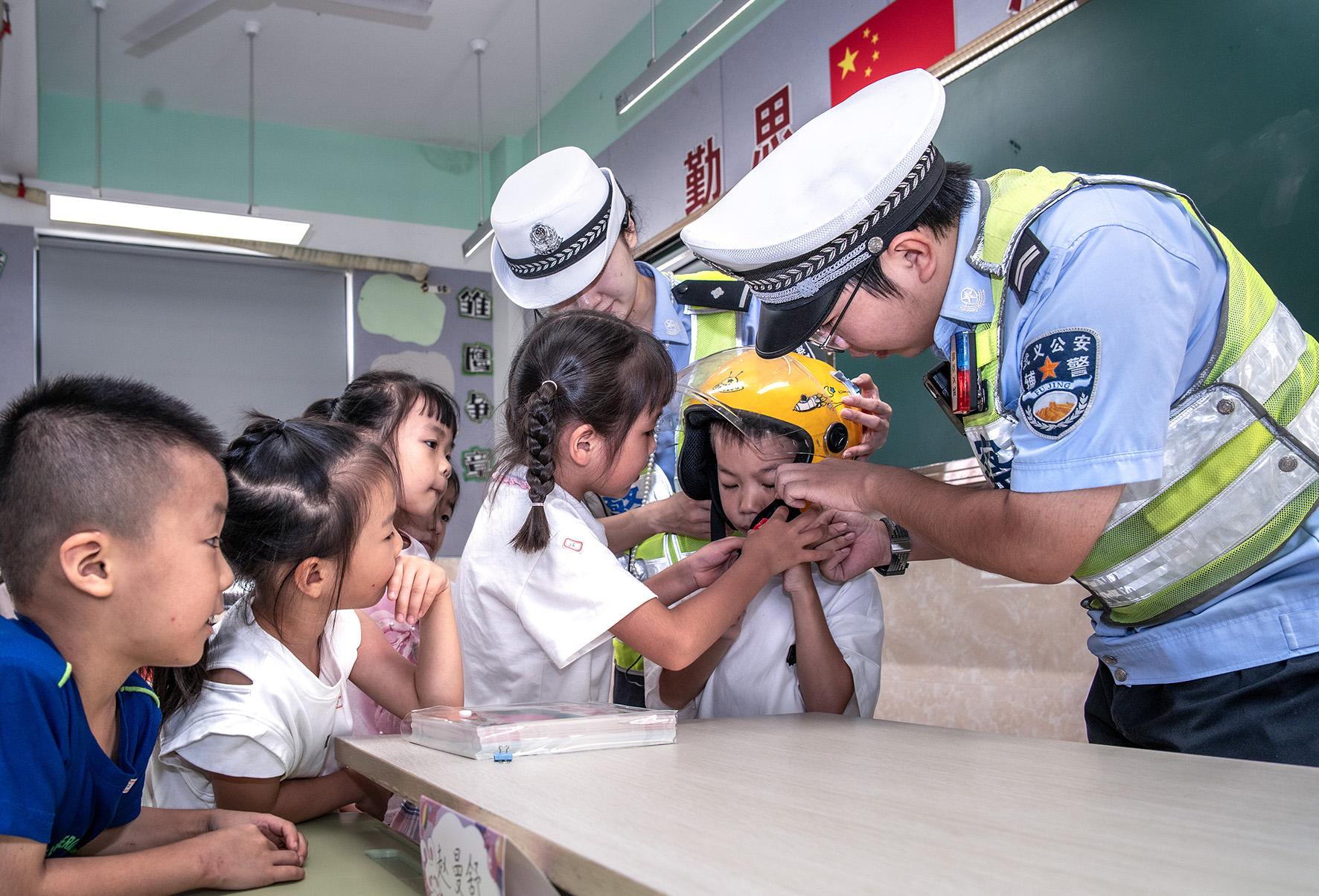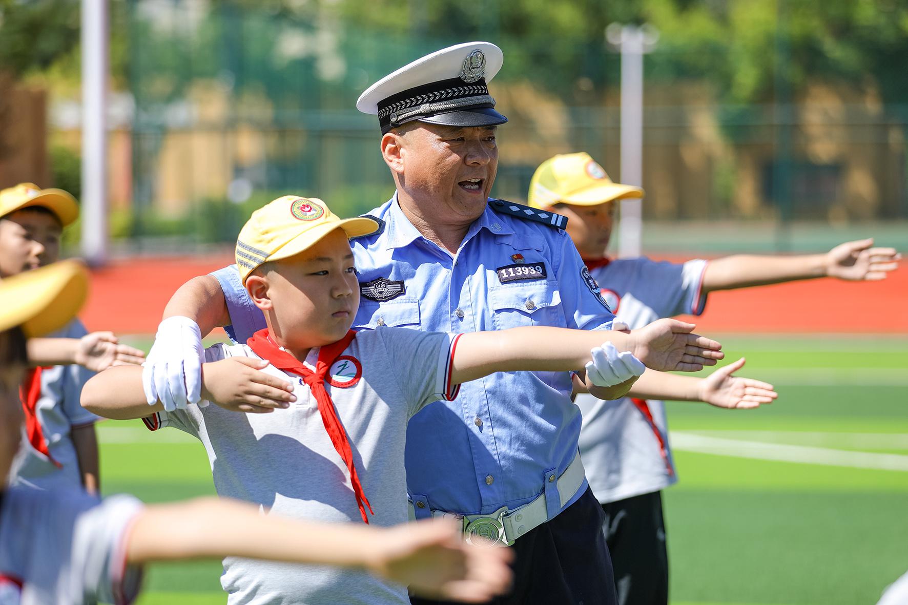 9月1日,山東省棗莊市公安局市中分局交通管理大隊(duì)鐵騎隊(duì)員在東湖小學(xué)向?qū)W生們普及交通安全知識(shí)。
