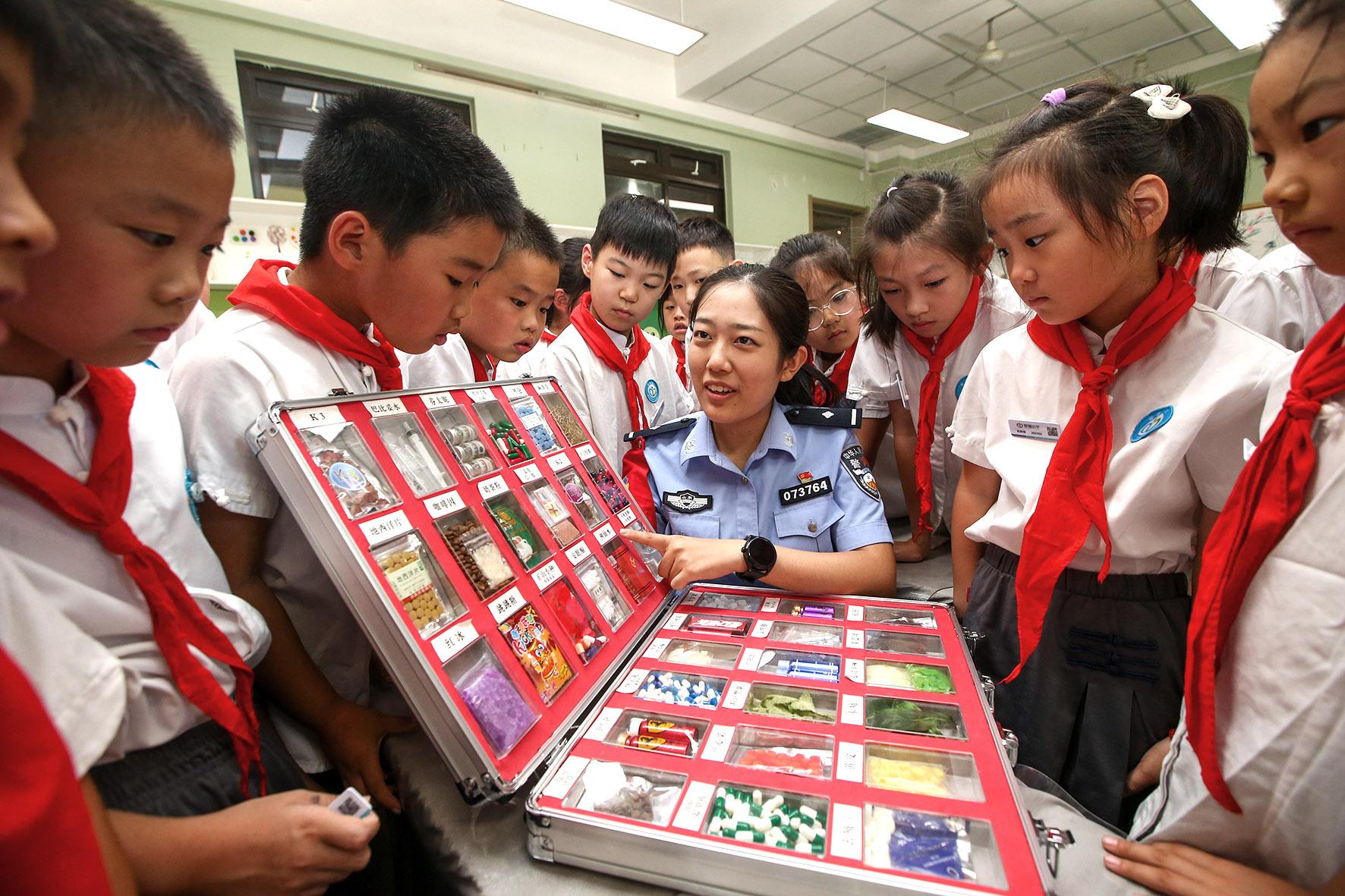 9月1日,山東省濟(jì)南市公安局市中分局民警來(lái)到愛(ài)都小學(xué)利用仿真毒品模型給學(xué)生講解禁毒常識(shí)。