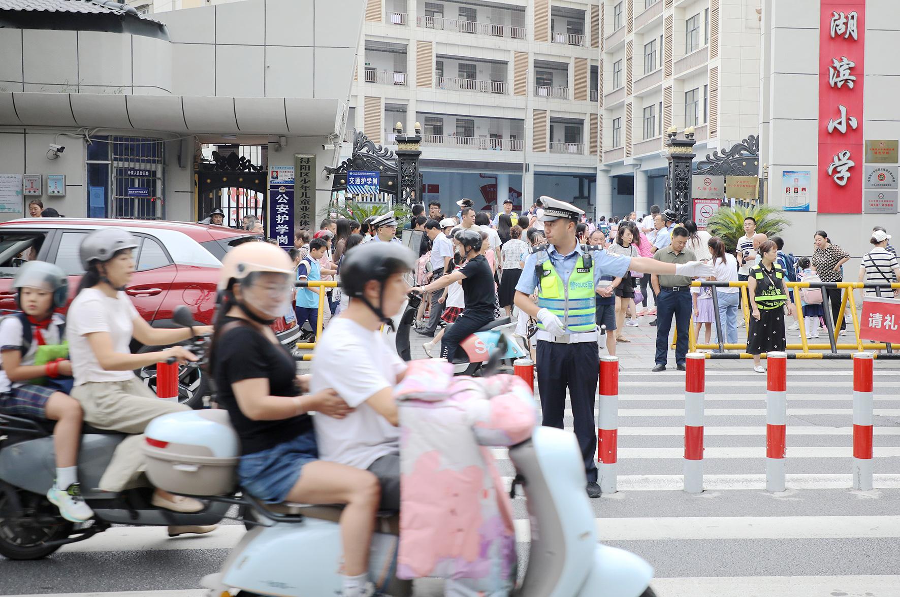 9月1日,江西省九江市公安局交管支隊(duì)潯陽(yáng)大隊(duì)民輔警在轄區(qū)學(xué)校門(mén)口維護(hù)秩序。