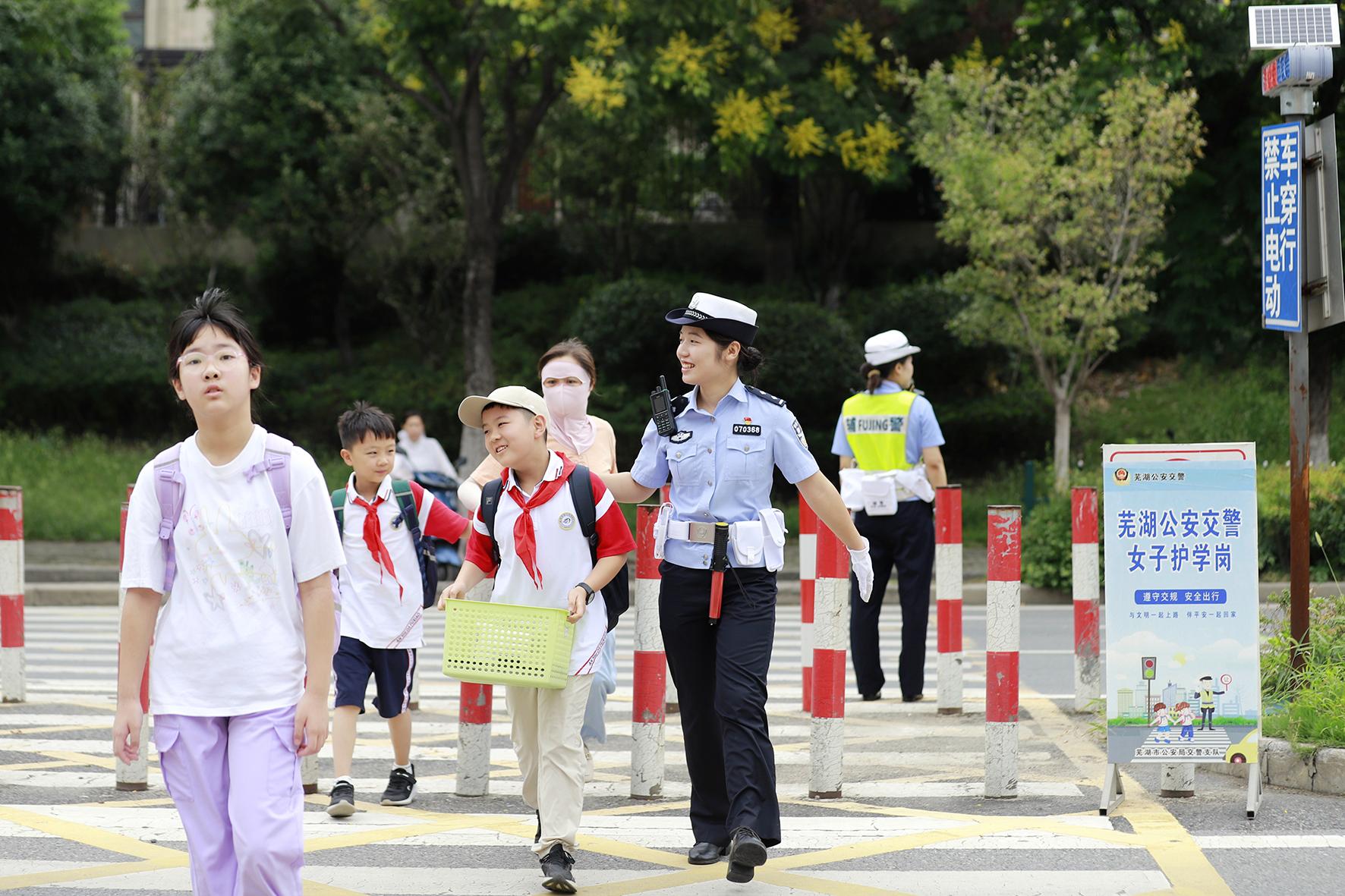 9月1日,安徽省蕪湖市公安局交警支隊(duì)弋江大隊(duì)女子護(hù)學(xué)崗民警,在安徽師范大學(xué)附屬小學(xué)(西校區(qū))護(hù)送小學(xué)生平安上學(xué)。