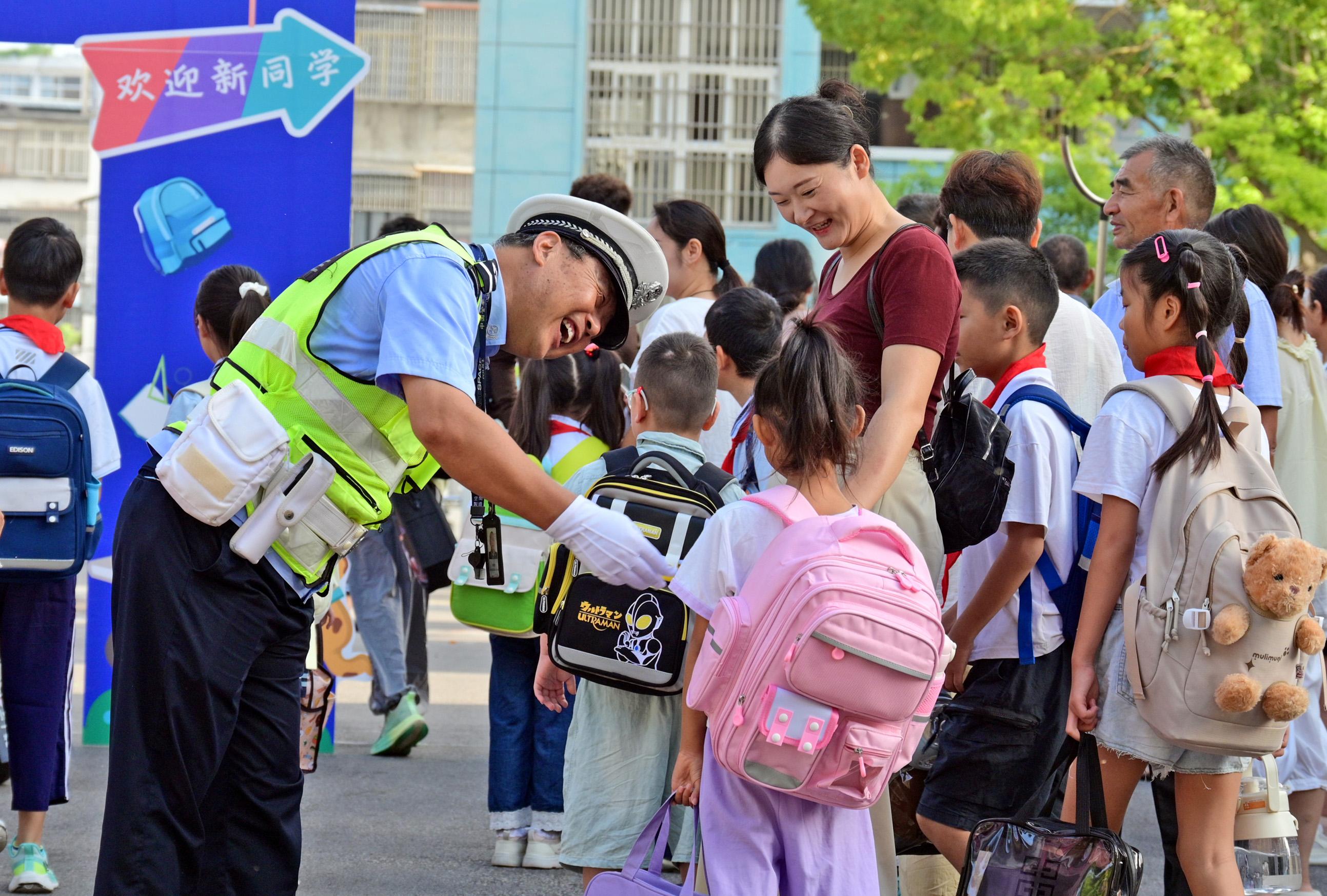 9月1日,安徽省固鎮(zhèn)縣公安局交管大隊(duì)輔警在第五小學(xué)護(hù)送學(xué)生安全入校。