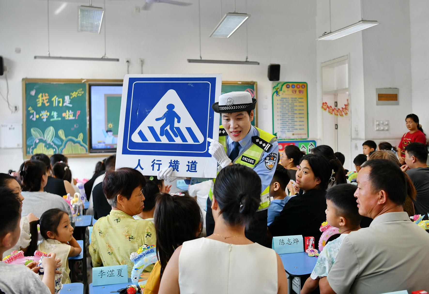 9月1日,安徽省阜南縣公安局交管大隊(duì)“護(hù)學(xué)崗”民警在第三小學(xué)向一年級(jí)新生和家長(zhǎng)們宣講出行安全知識(shí)。