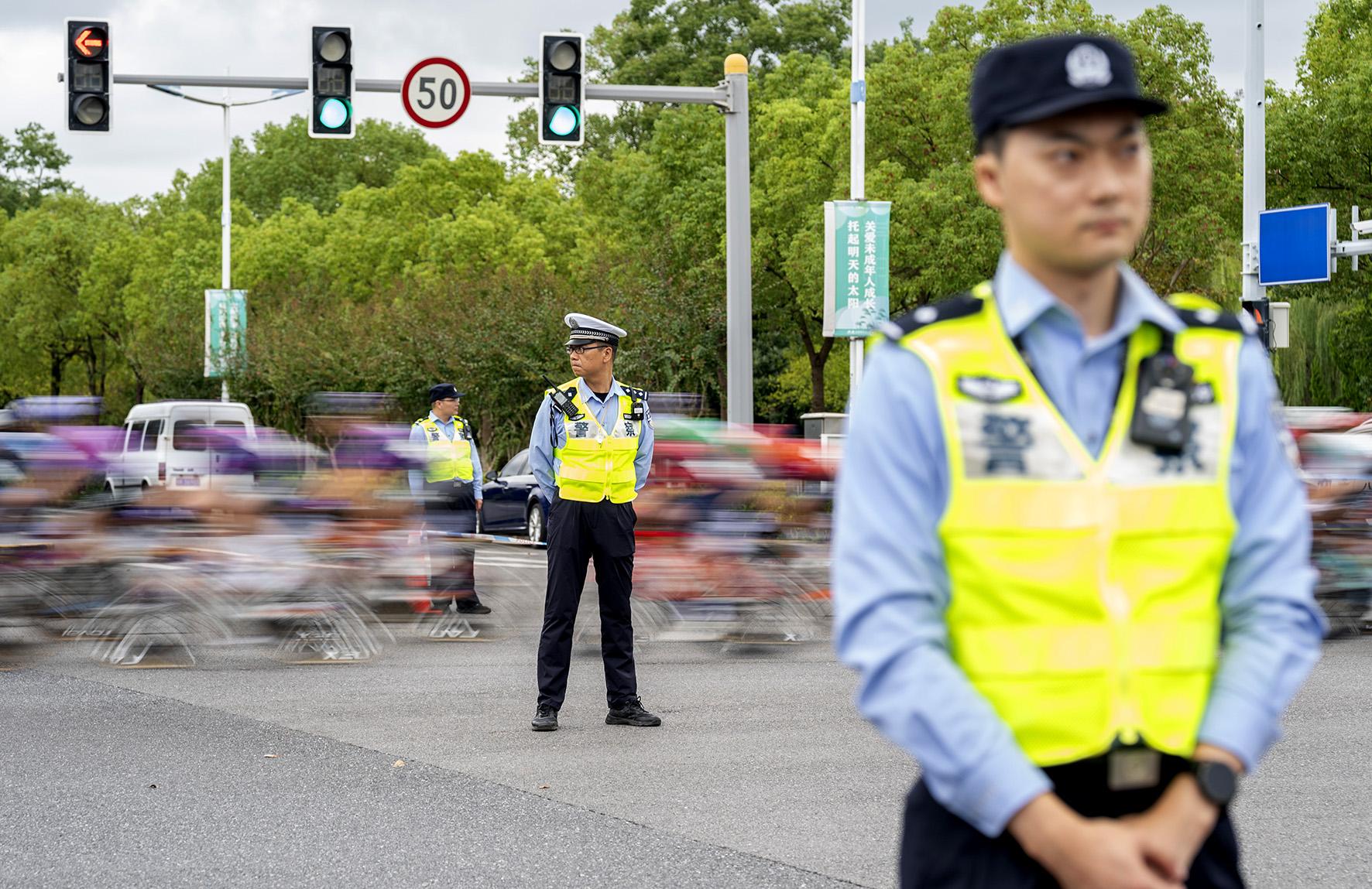 10月16日,上海市公安局崇明分局交管支隊(duì)民輔警在2025環(huán)崇明島國際自盟女子公路世界巡回賽賽道沿線開展執(zhí)勤工作。