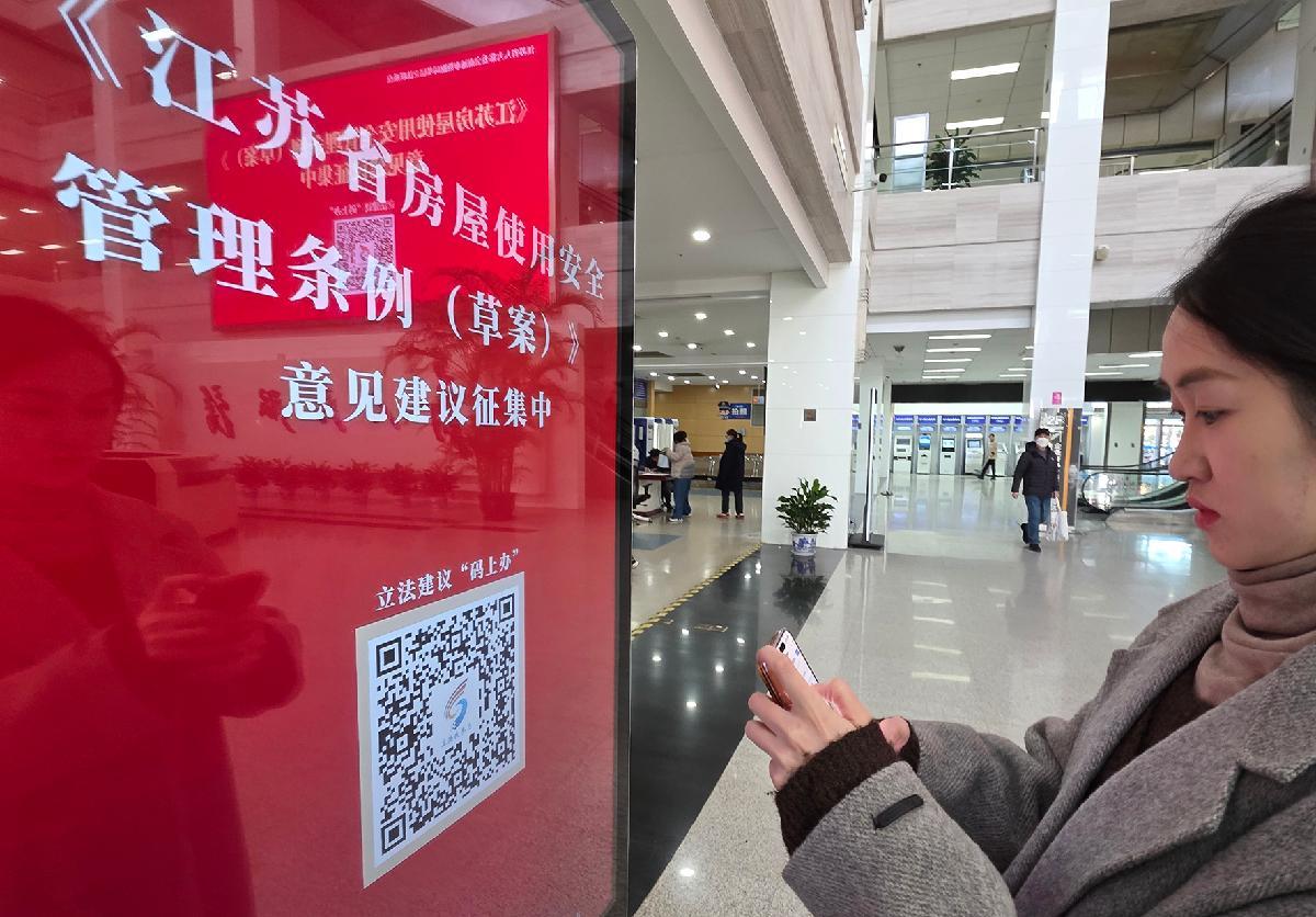 12月3日,在江蘇省南通市政務(wù)服務(wù)中心大廳,前來辦事的市民通過掃描“立法我參與”二維碼,對(duì)正在征求意見的《江蘇省房屋使用安全管理?xiàng)l例(草案)》提出修改完善建議。