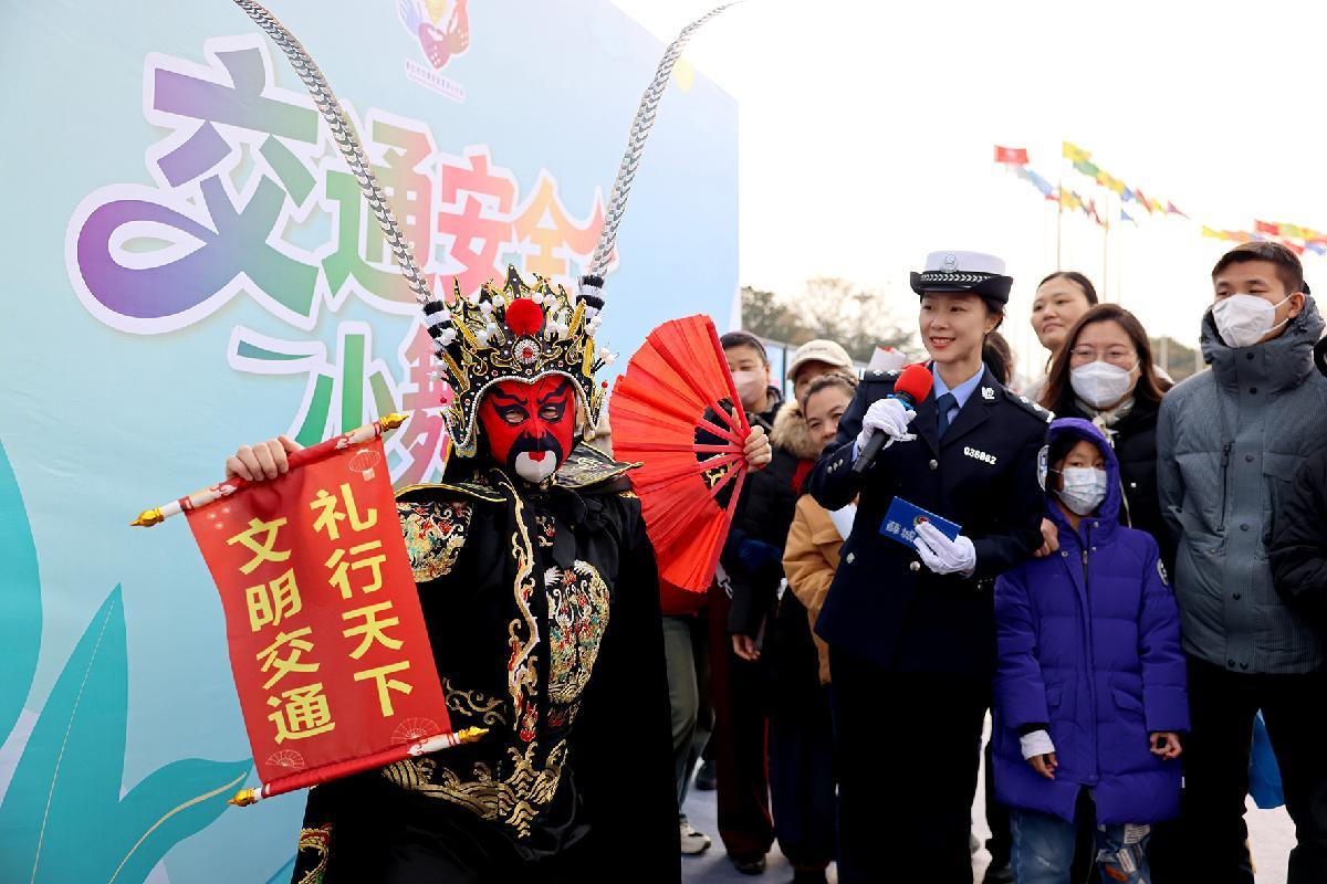 12月2日,在山東省棗莊市光明廣場“交通安全小舞臺”,棗莊市公安局市中分局交通管理大隊民警利用傳統(tǒng)“變臉”表演方式宣傳交通安全知識。