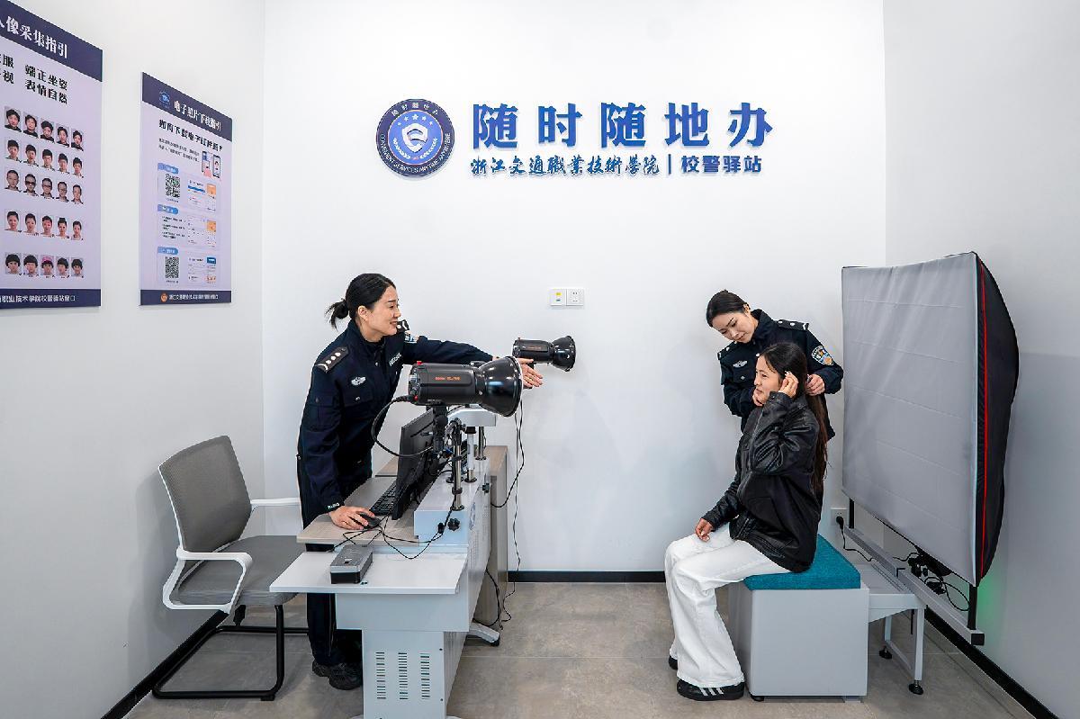 12月9日,浙江省長(zhǎng)興縣公安局林城派出所駐浙江交通職業(yè)技術(shù)學(xué)院(長(zhǎng)興校區(qū))“校警驛站”工作人員為學(xué)生補(bǔ)辦身份證件。
