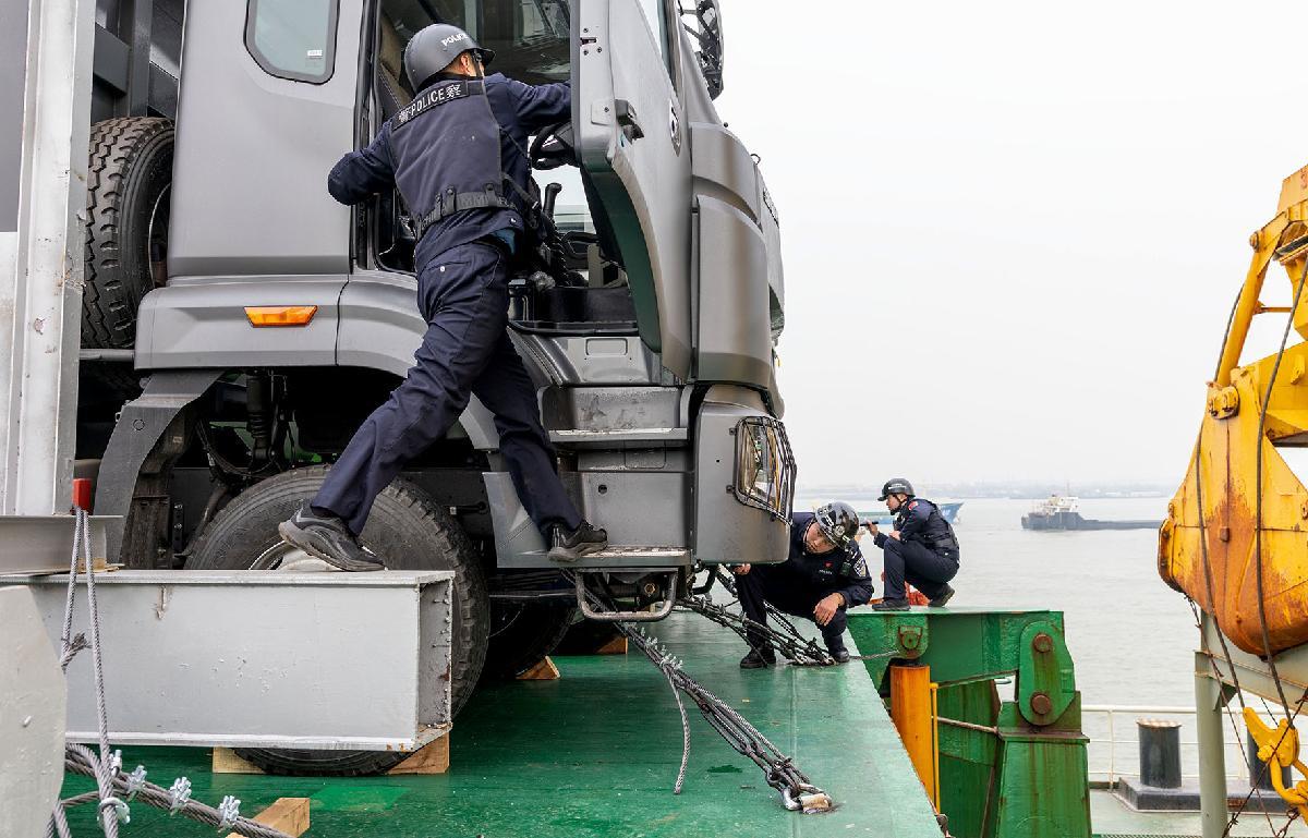 圖為民警對(duì)離港船舶進(jìn)行查驗(yàn)。