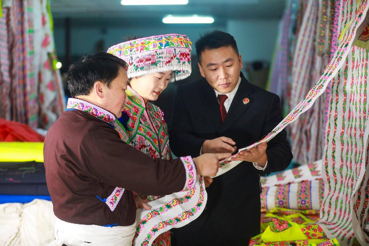 1月7日,貴州省黔西市檢察院檢察干警深入轄區(qū)鐵石苗族彝族鄉(xiāng),走訪當?shù)丶彝プ鞣坏拿缋C產業(yè),向苗繡同胞宣傳工藝技法、品牌標識等保護及維權知識。